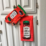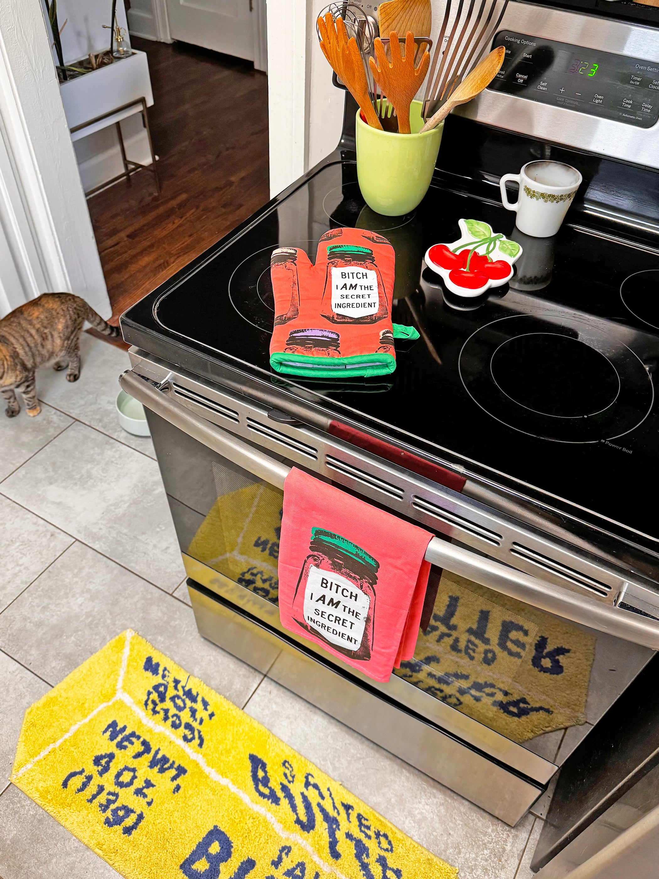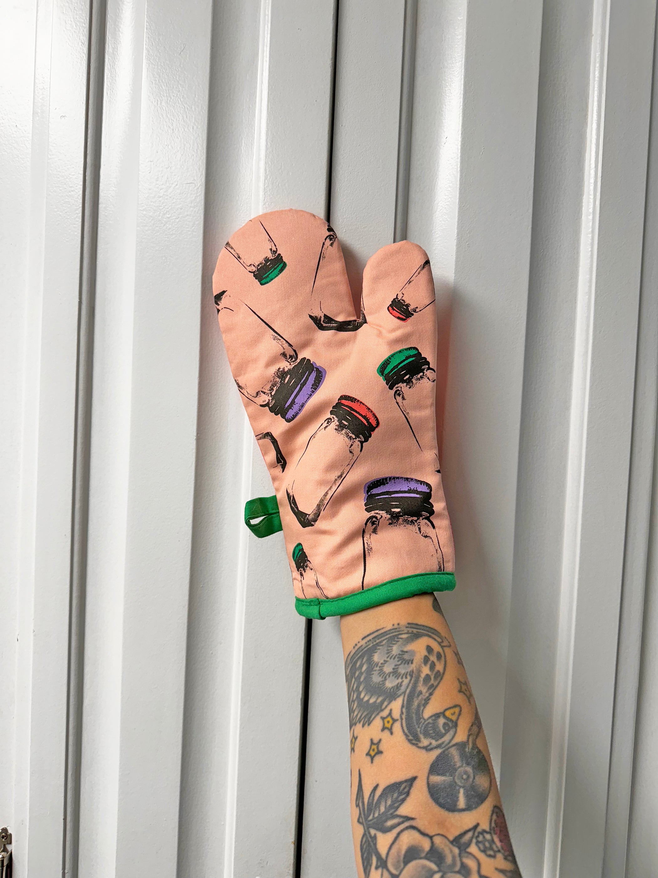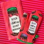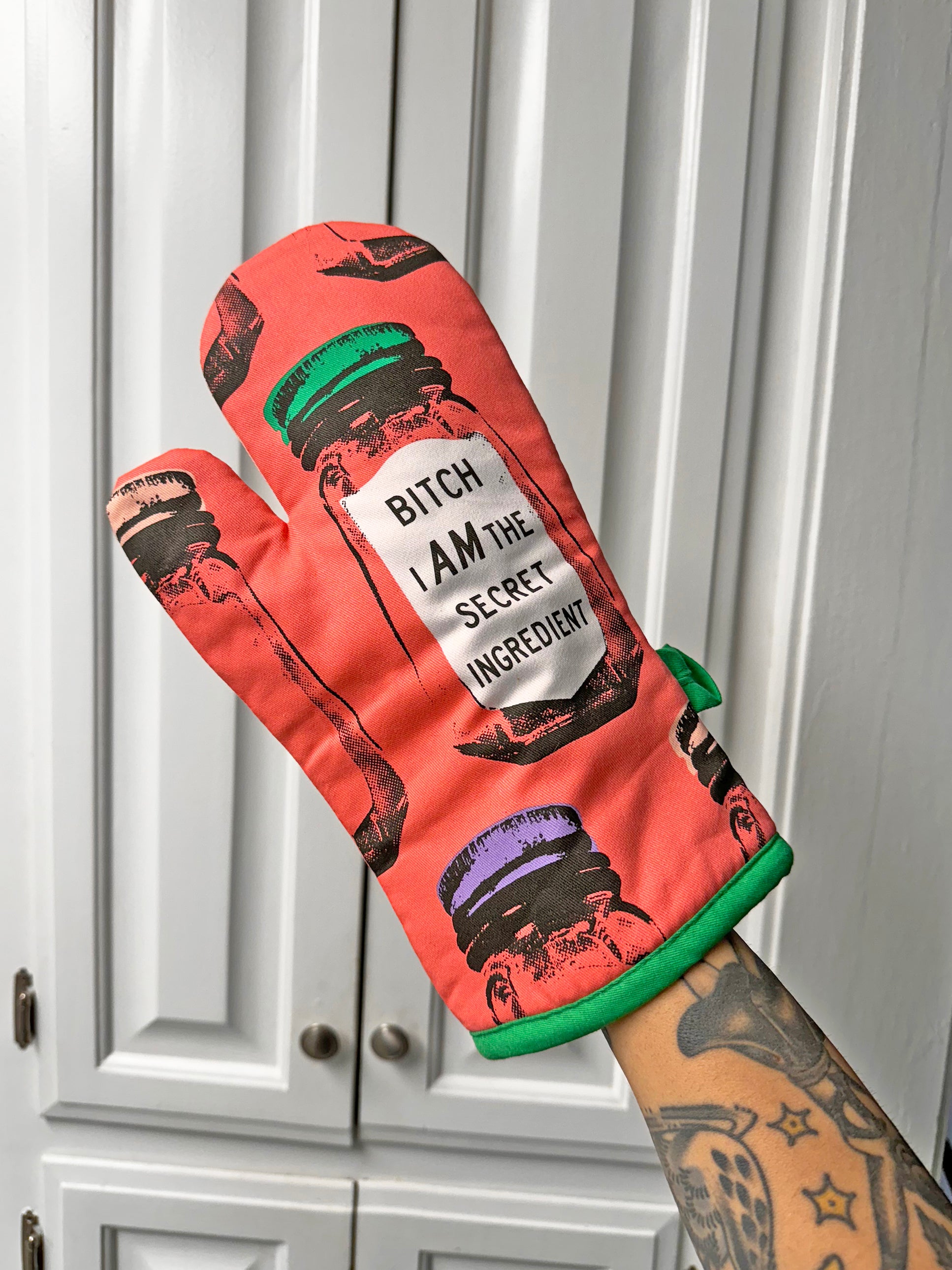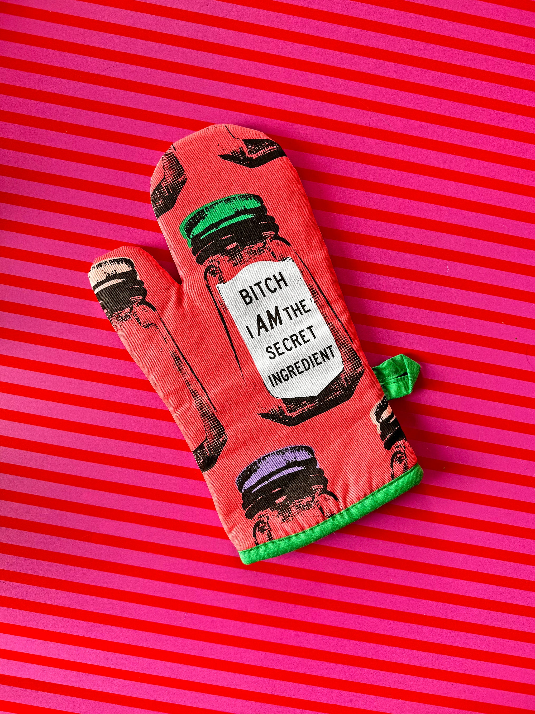 This high quality oven mitt is insulated and made with 100% cotton material! One side of the oven mitt features a super secret ingredient jar that reads "bitch i AM the secret ingredient" and the other side is a lighter shade of pink that features multiple ingredient jars with different colored lids. The bottom edge of the mitt is a gorgeous bright green color and has a matching loop for convenient hanging when not in use!