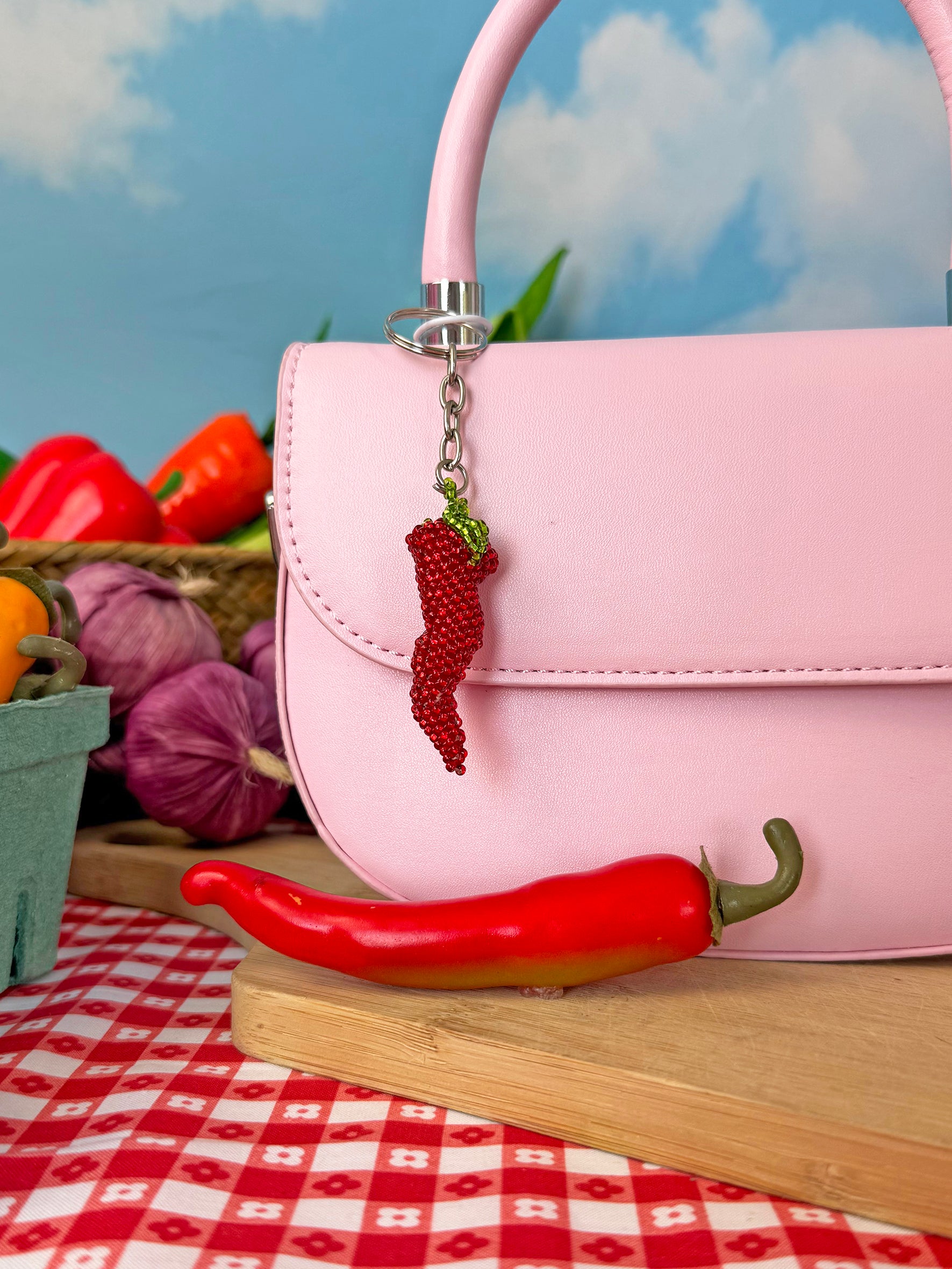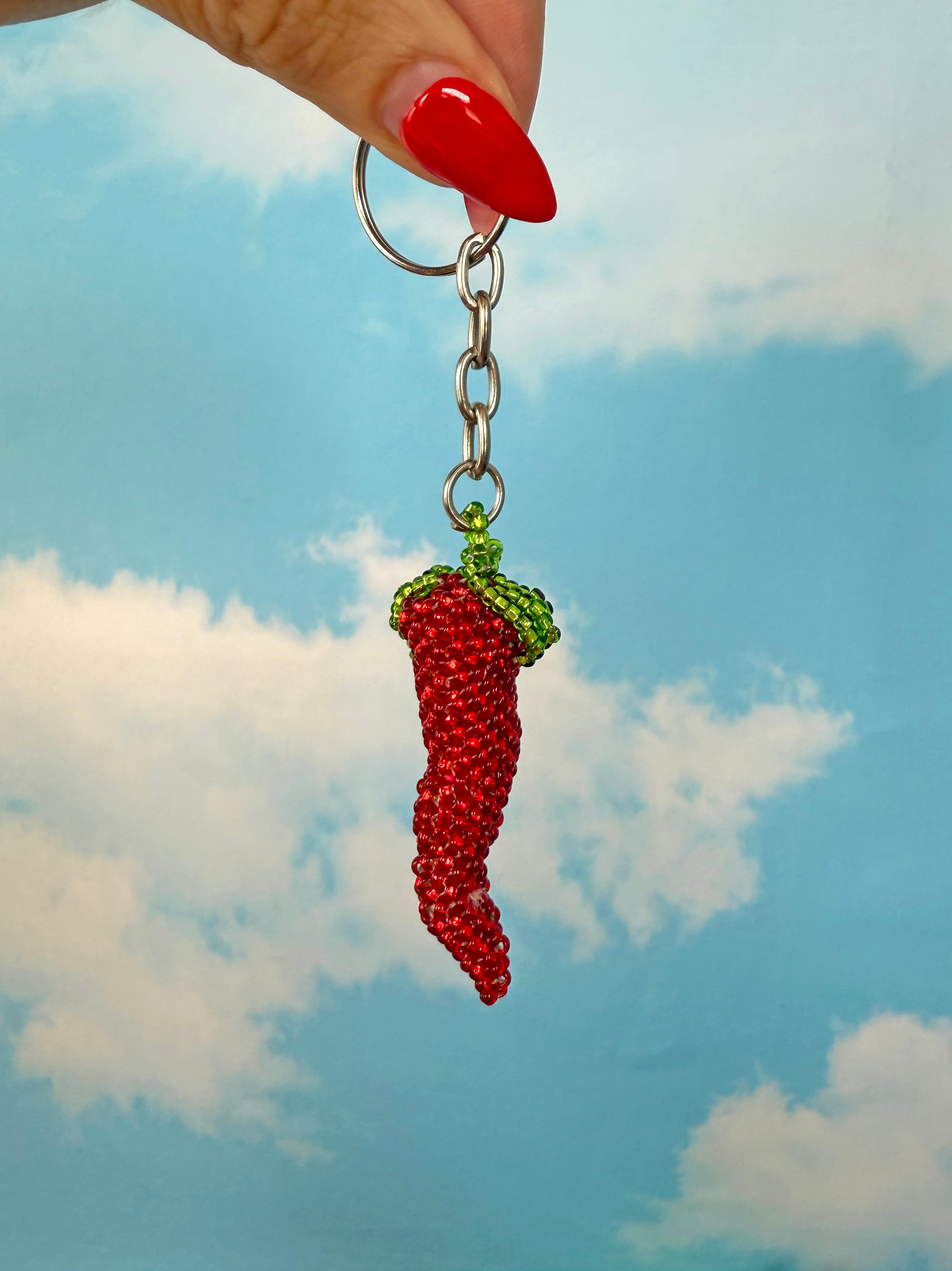 How precious is this keychain?! It features the cutest lil red chili pepper with a bright green stem on a silver keyring! The perfect accessory for your keys, water bottle, bag, or whatever else you want to put it on!