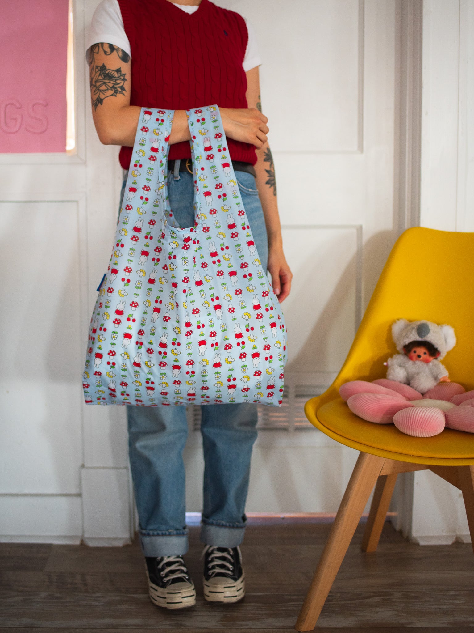 If you aren't a baggu girlie, you should be! This reusable bag features a repeating design of Miffy surrounded by flowers, mushrooms, and birds! It comes in the standard Baggu size, perfect for the grocery store, weekend getaways, the pool and beach, picnics, etc!