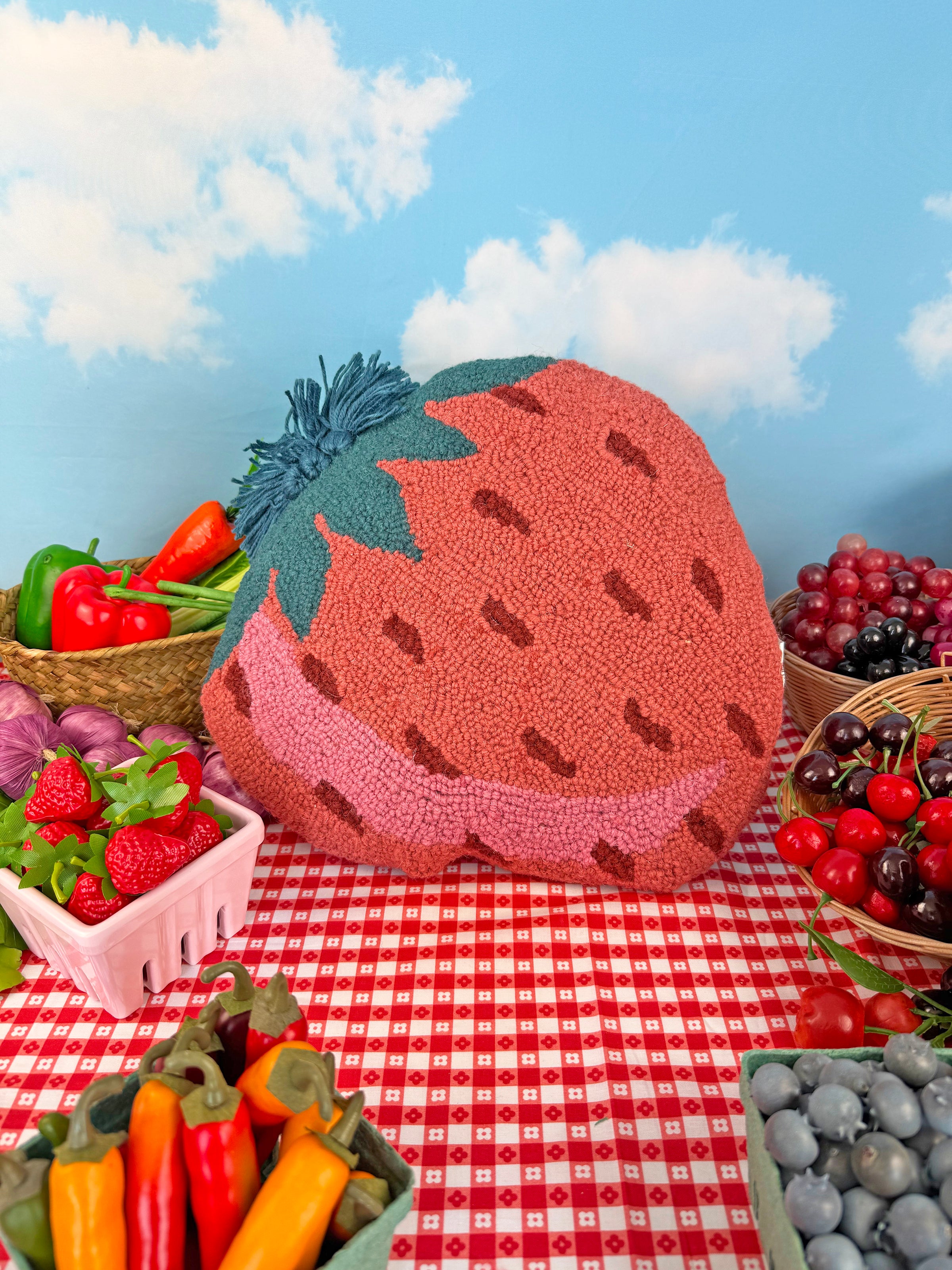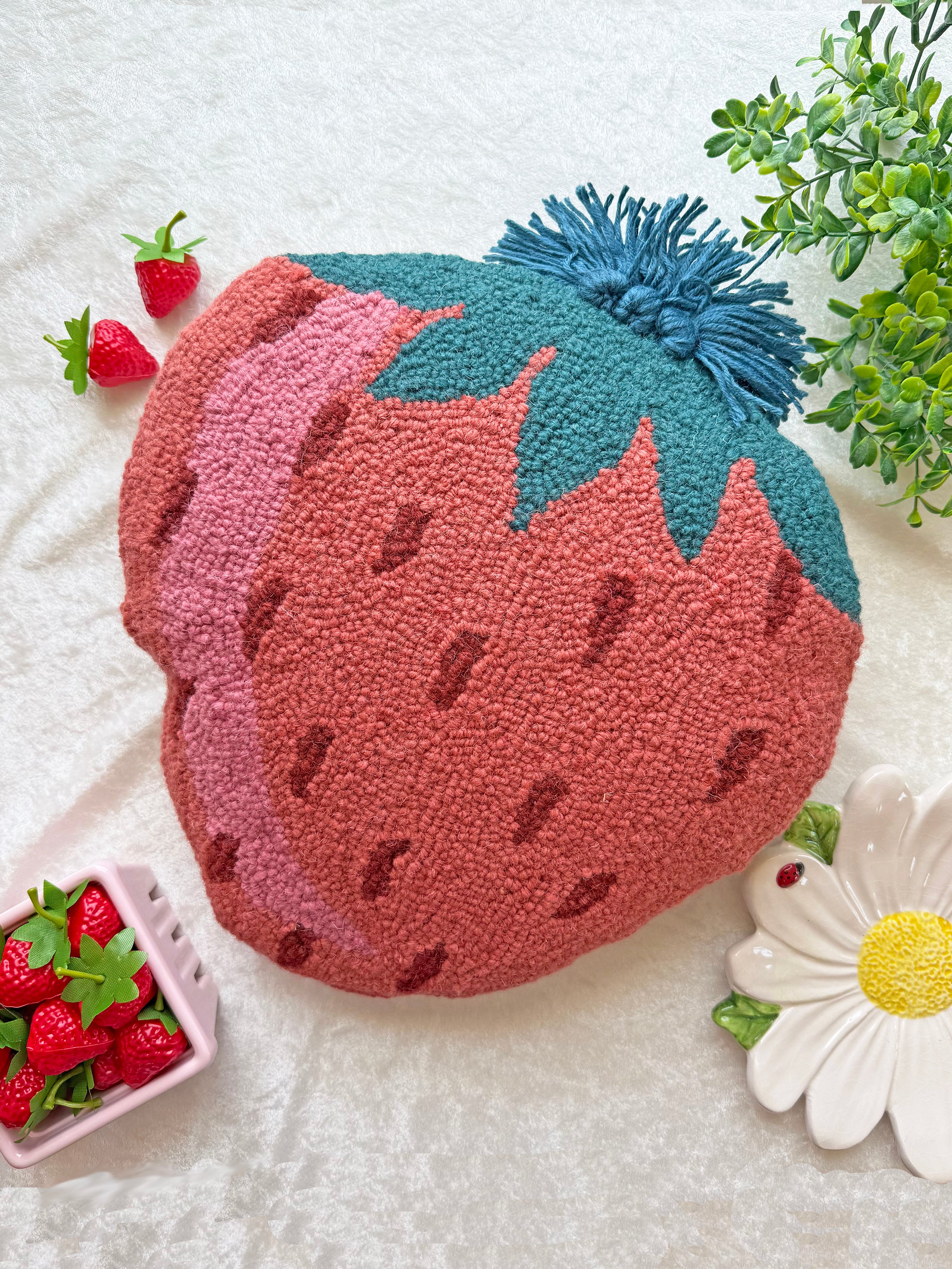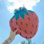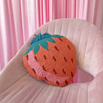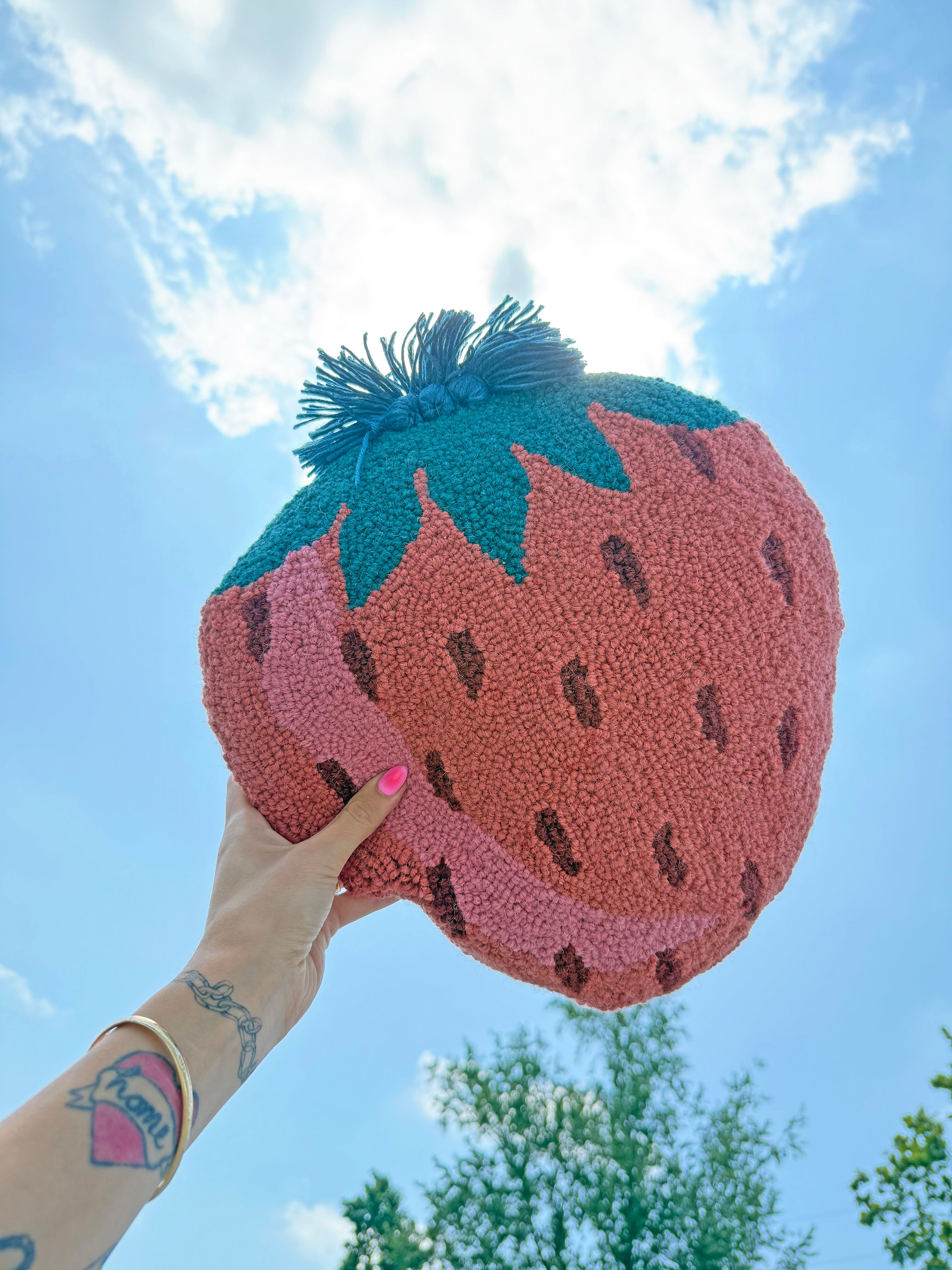 Your couch called, it needs this pillow stat!! This high quality throw pillow is shaped like a cute 'lil red strawberry with green leaves and blue tassels on the top. Delish!
