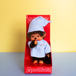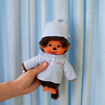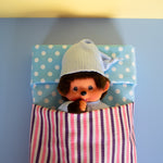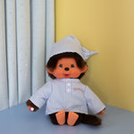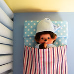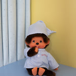This sleepy Monchhichi is wearing the sweetest pajama set you've ever seen, with a white and blue striped shirt and matching nightcap! Perfect for gifting, adding to your growing collection, or just to add some fun vibes to your space!