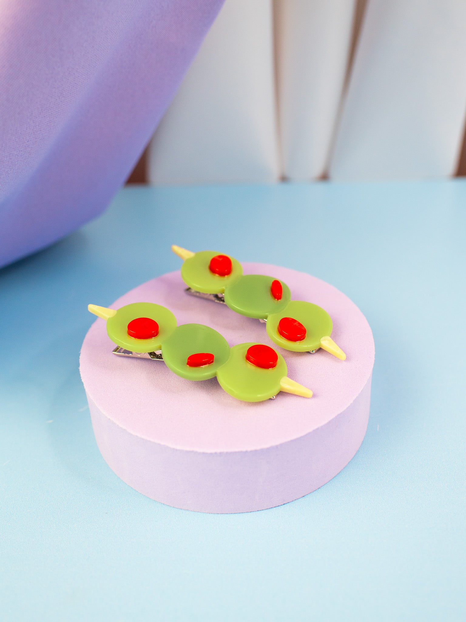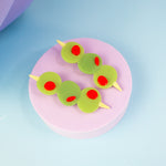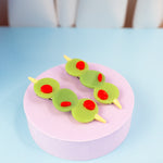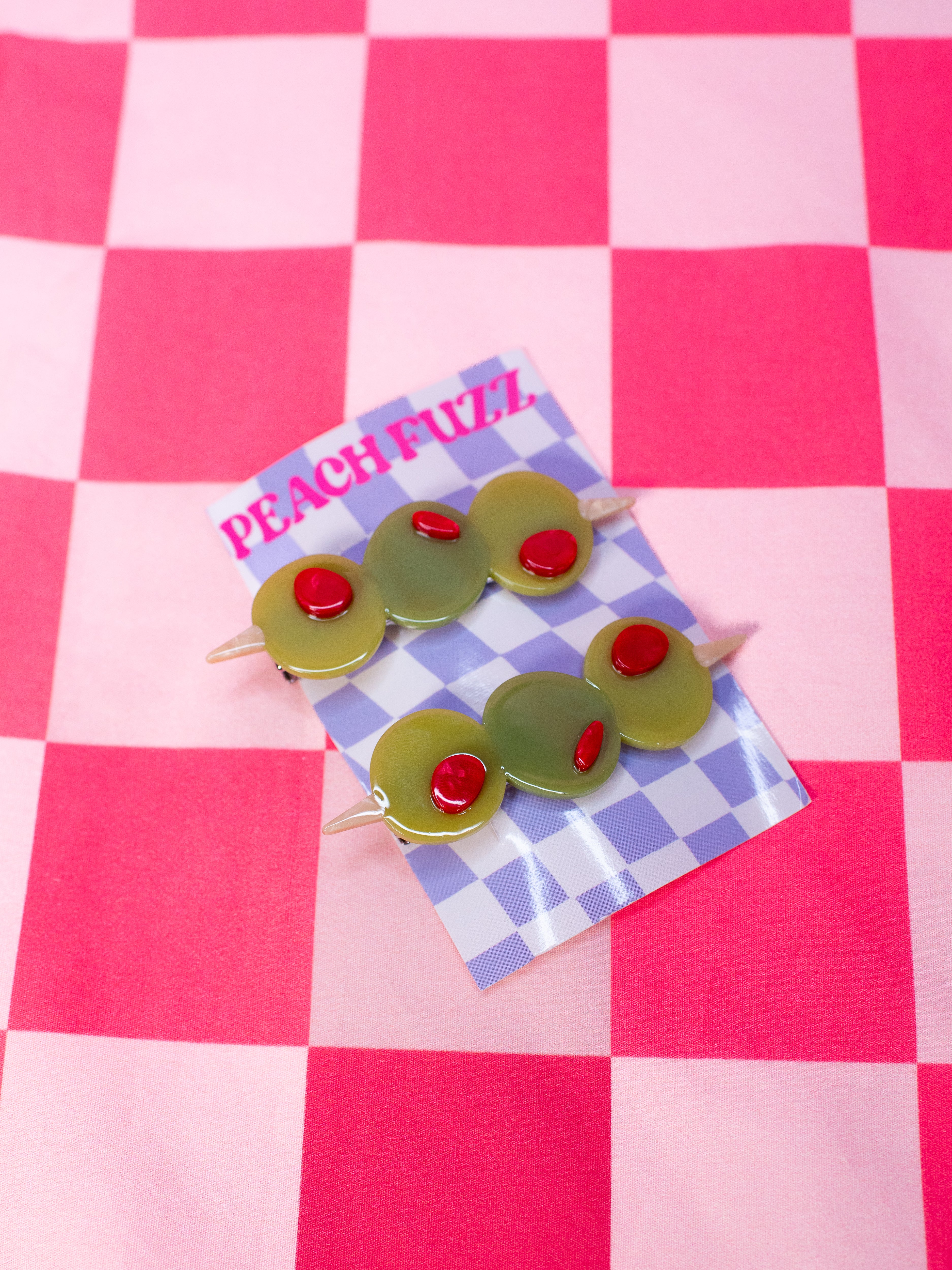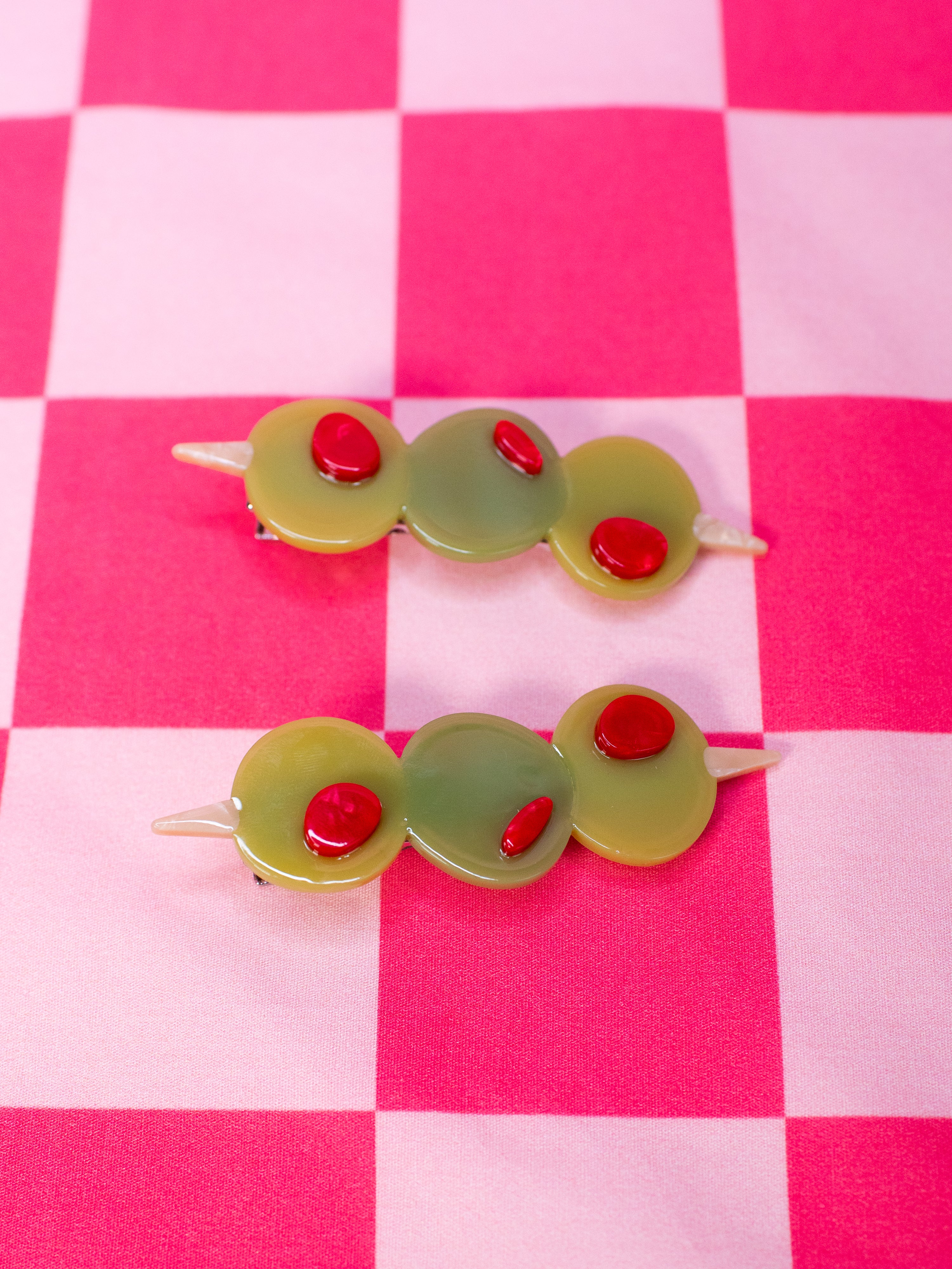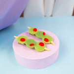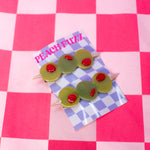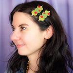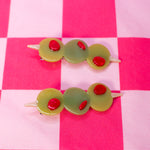 Add a pop of kitschy cuteness to your look with this set of green olive hair clips, complete with red pimento! Looks cute in an updo or to hold some hair back when its down!