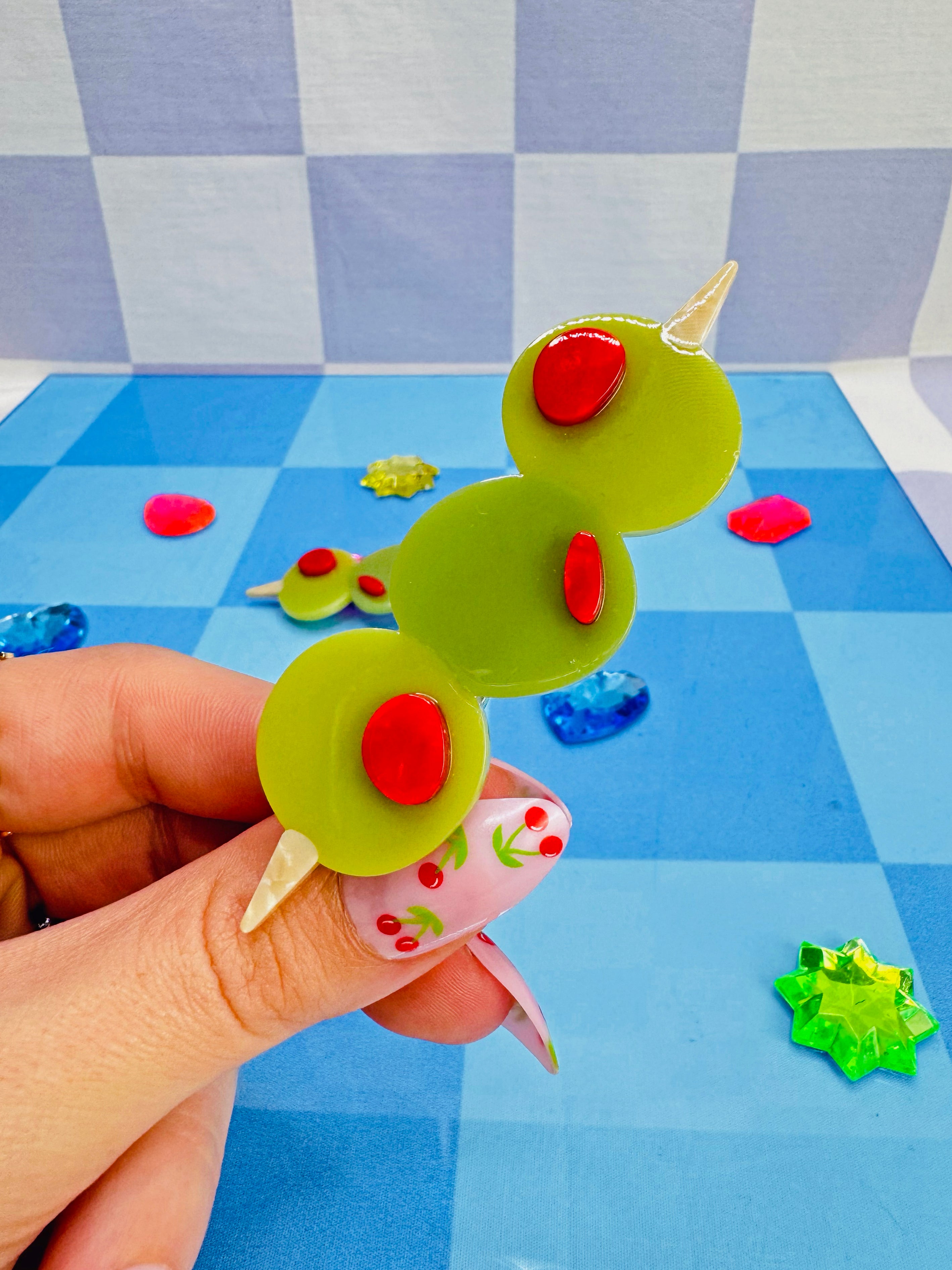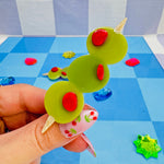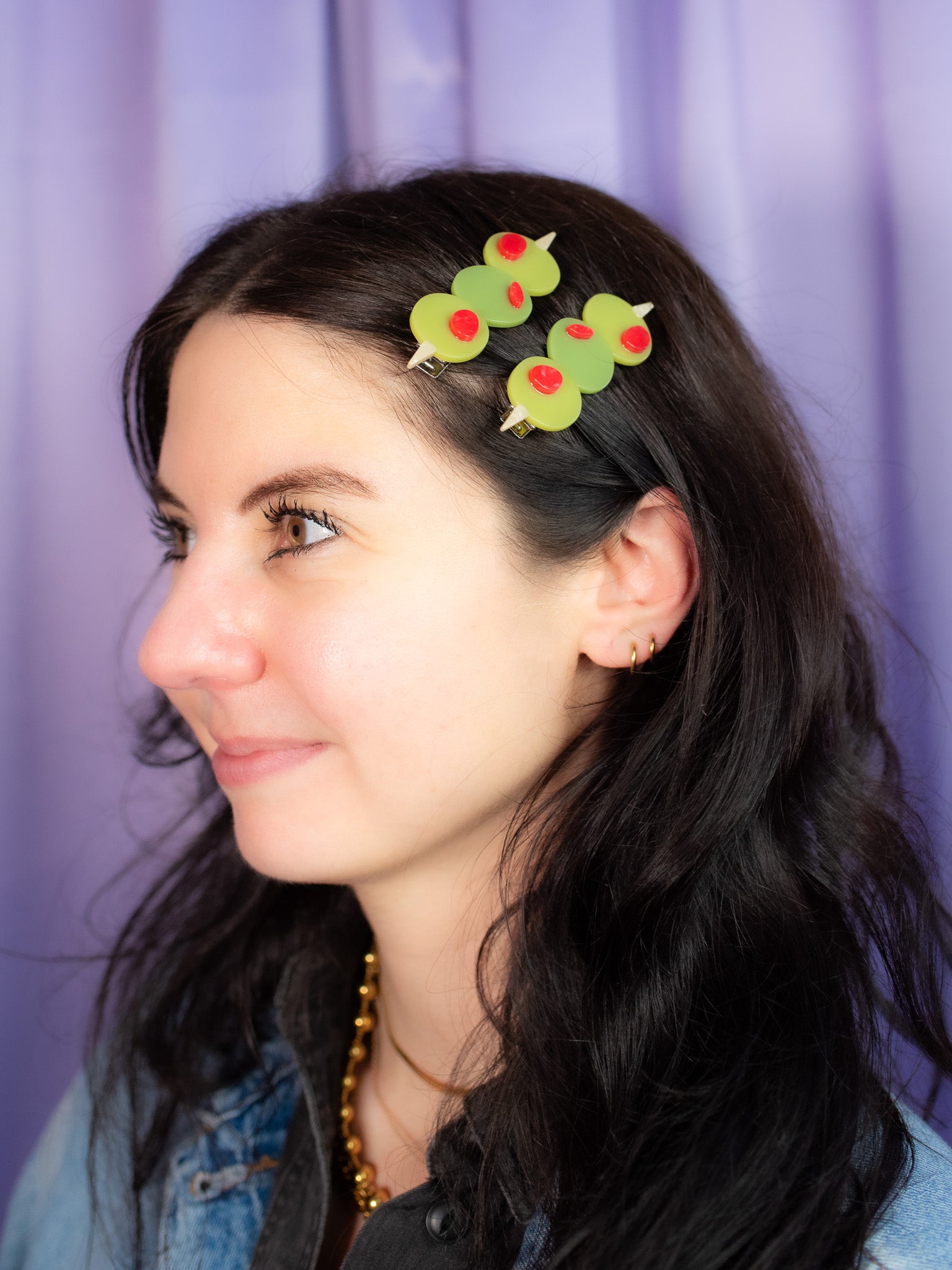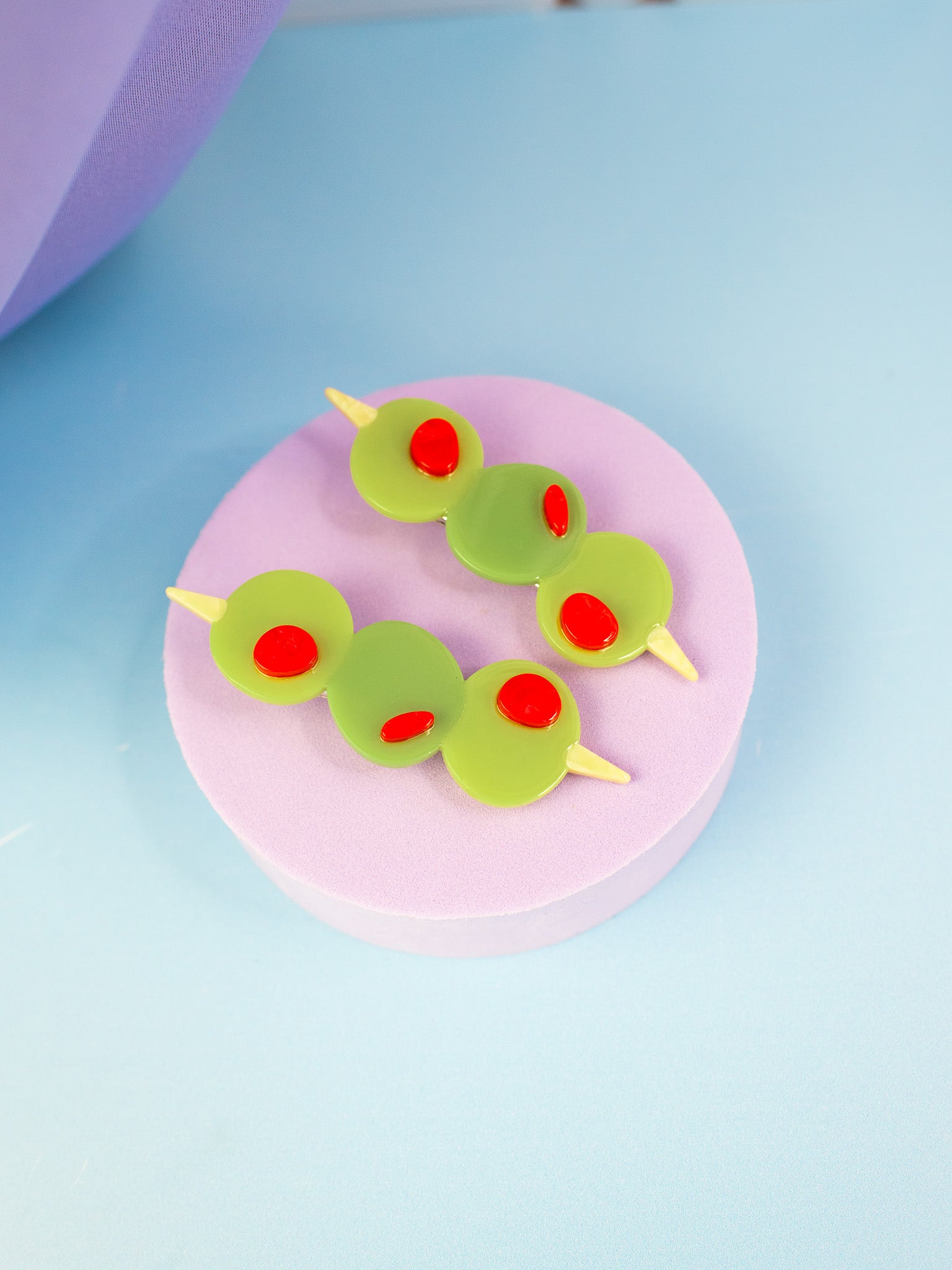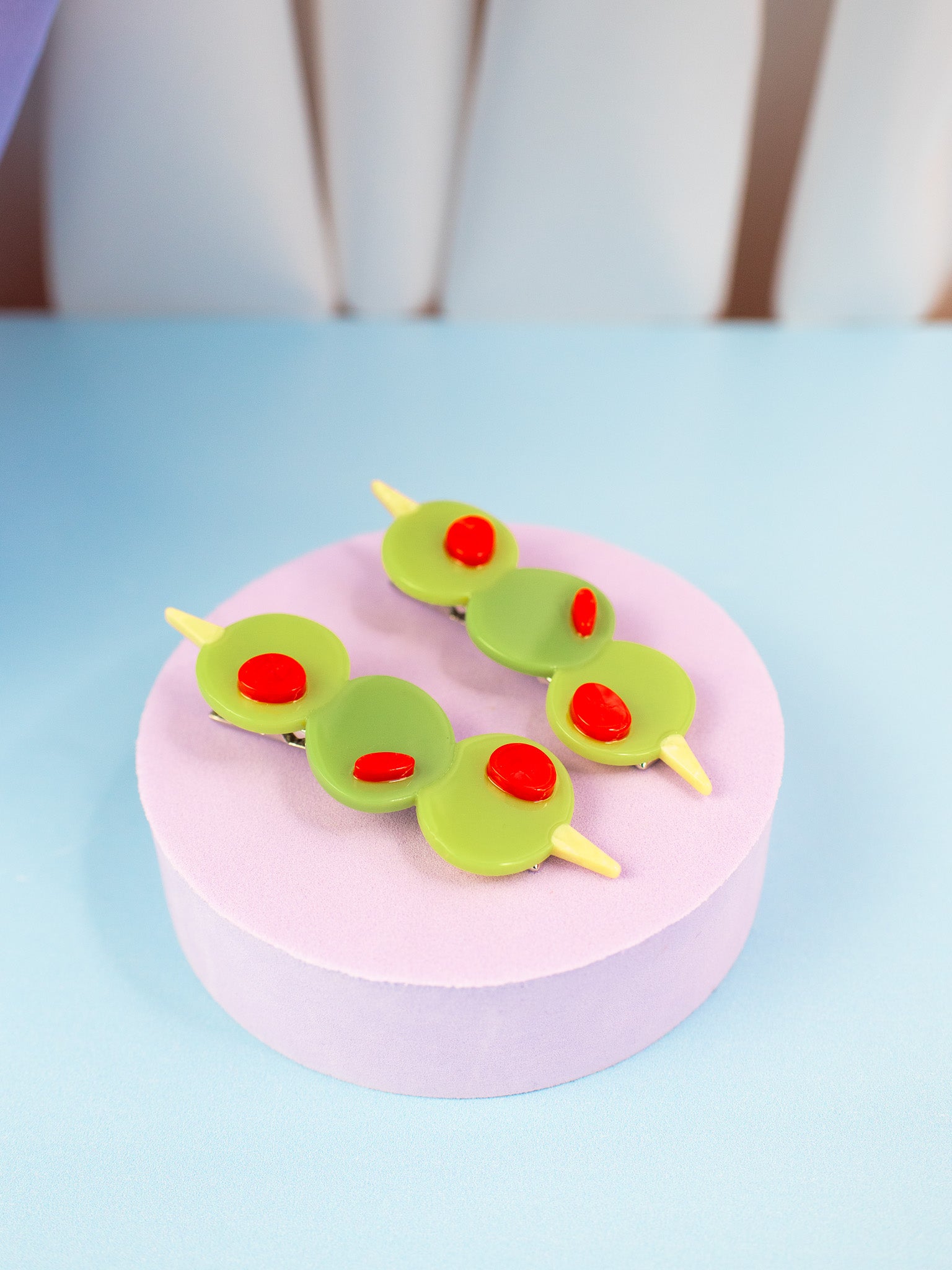 Add a pop of kitschy cuteness to your look with this set of green olive hair clips, complete with red pimento! Looks cute in an updo or to hold some hair back when its down!