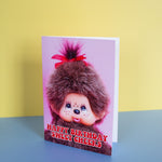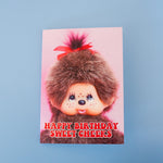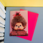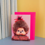 Features an adorable picture of monchhichi and text that reads "Happy Birthday Sweet Cheeks" Pink envelope included!