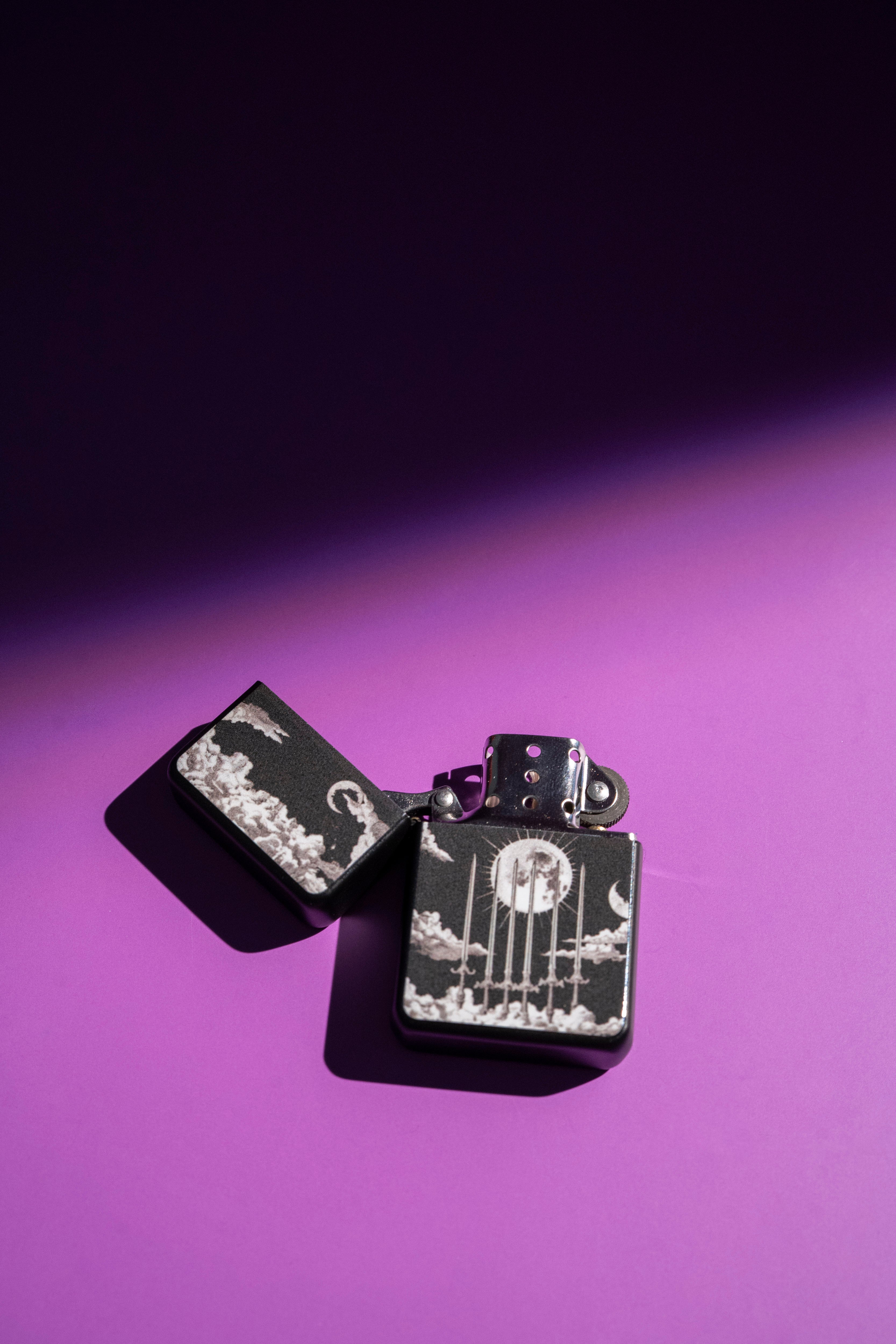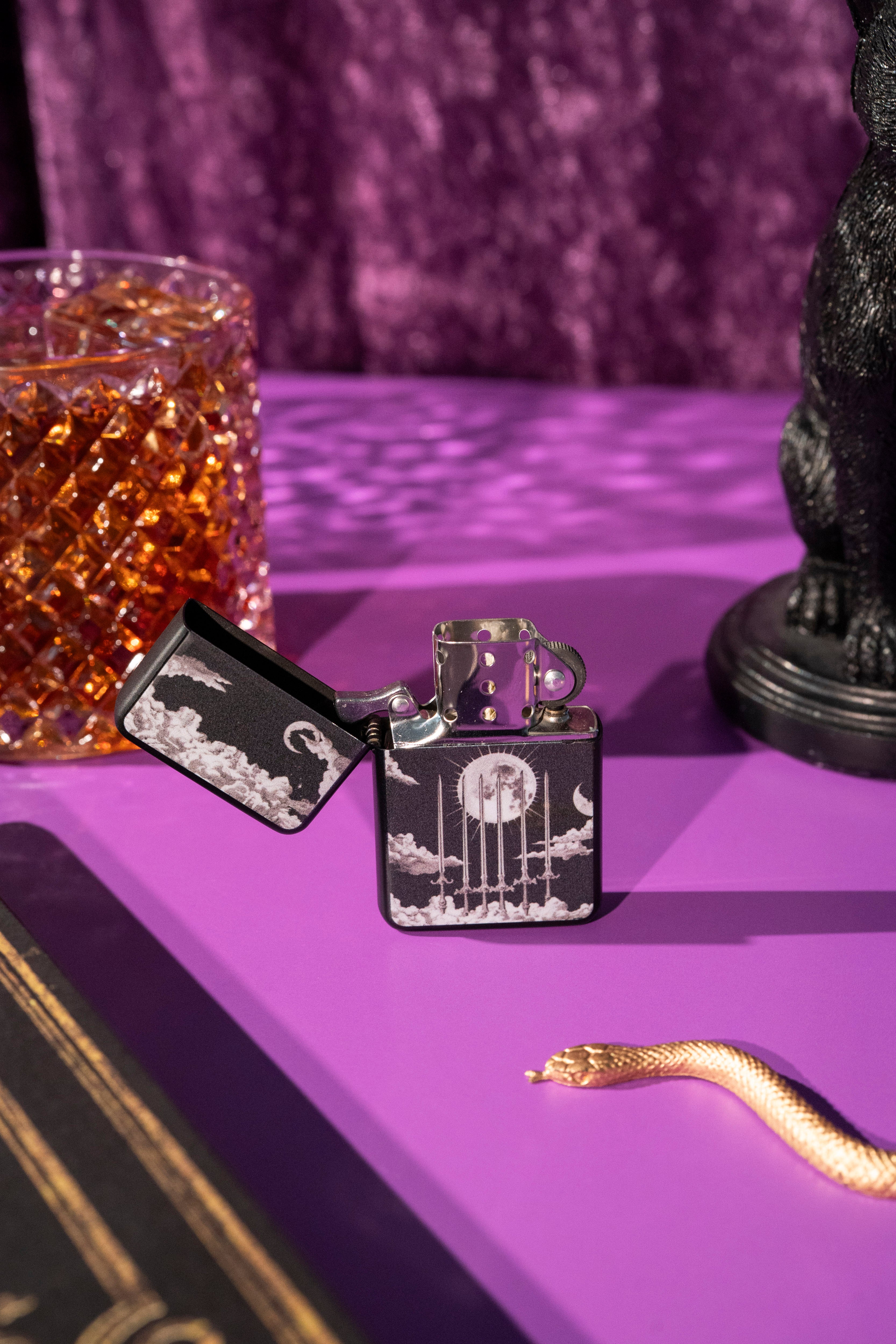 This matte black lighter features a tarot inspired six of swords design! Perfect for lighting cigarettes, candles, or whatever else you need a fire for.