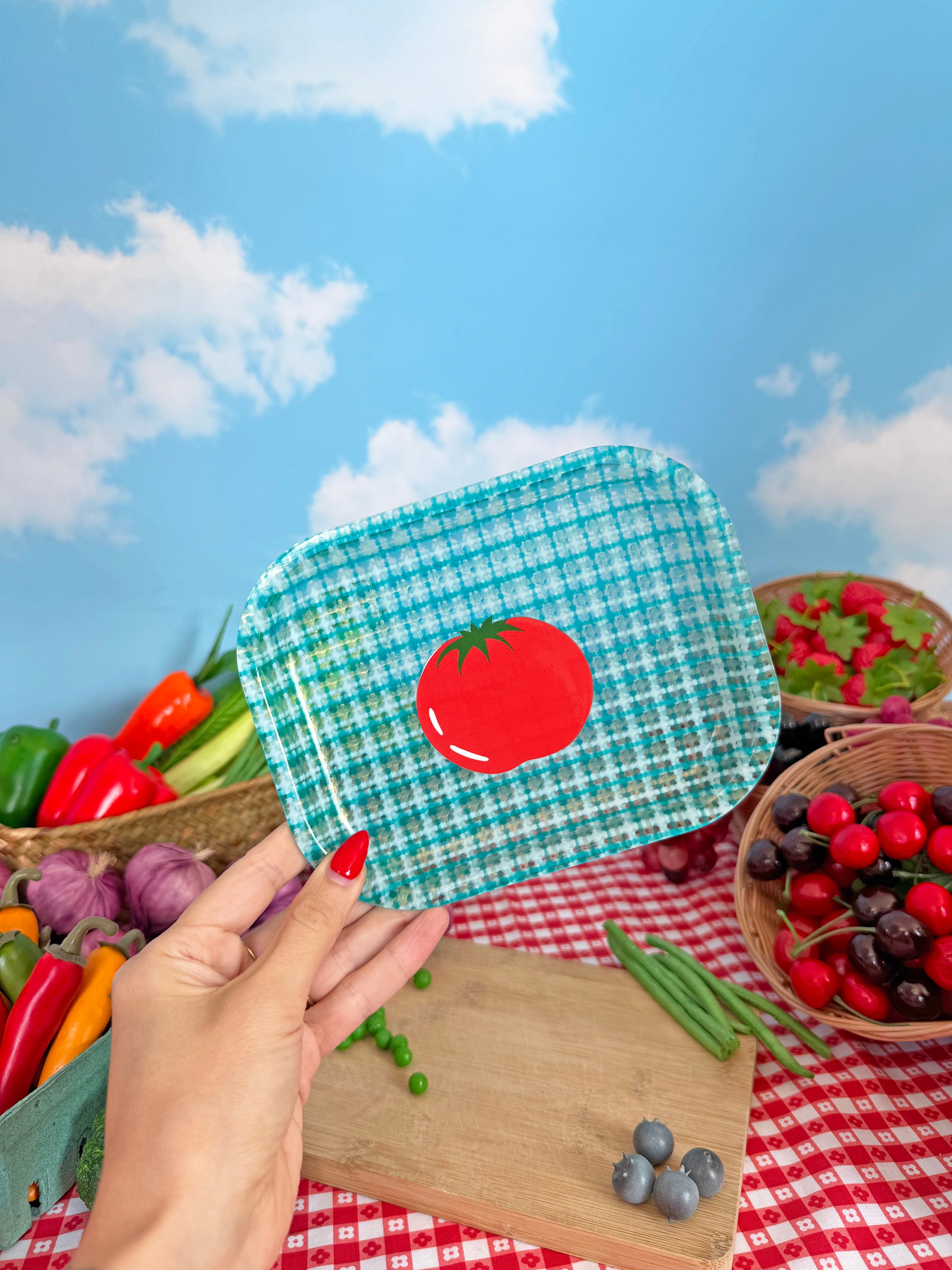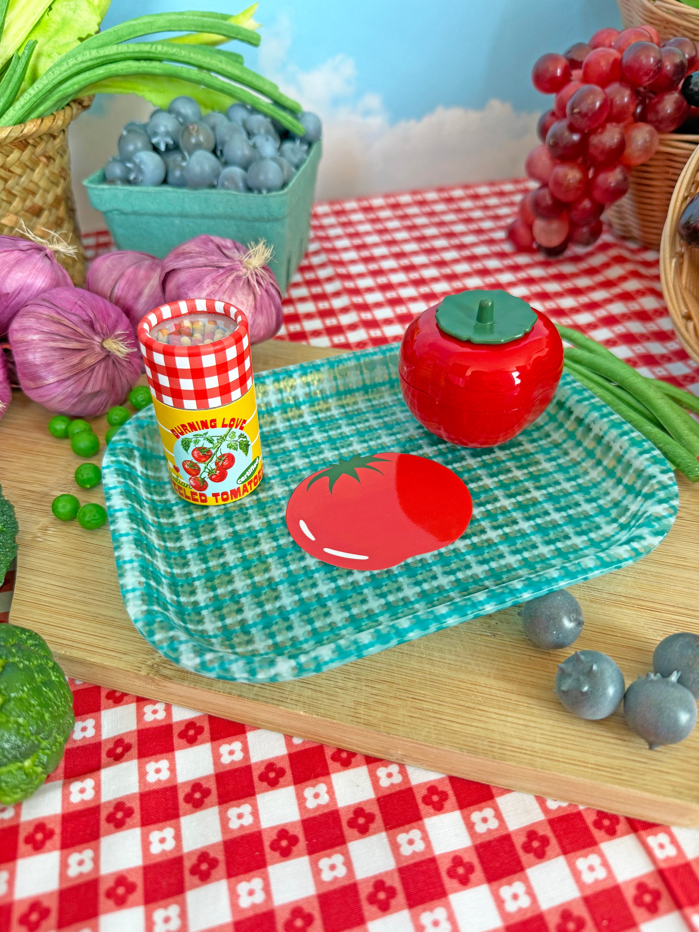 This tray features an adorable blue and white plaid pattern and cute tomato decal in the center! Whether you smoke or just want an adorable piece to decorate your home, this tray is perfect.