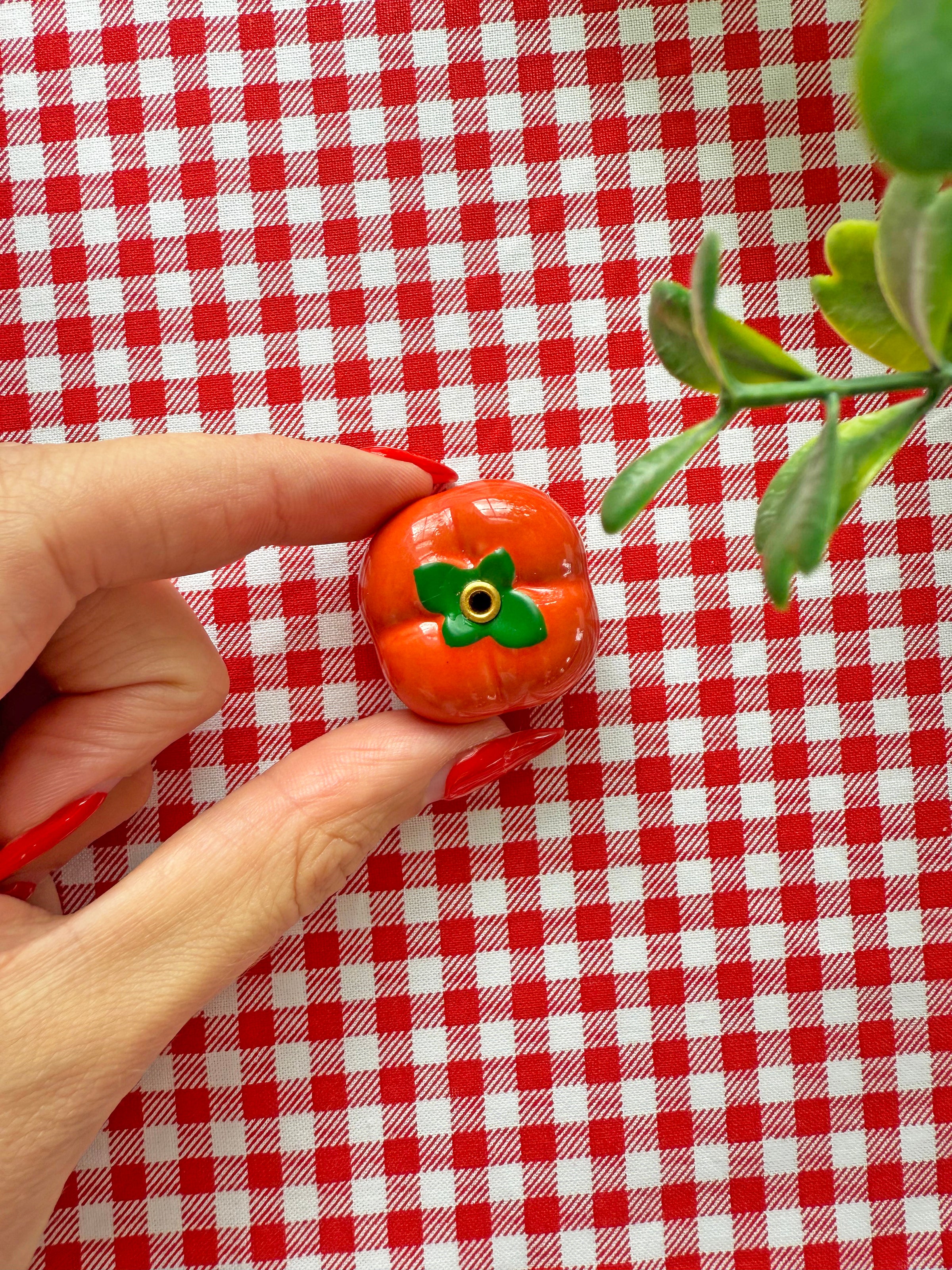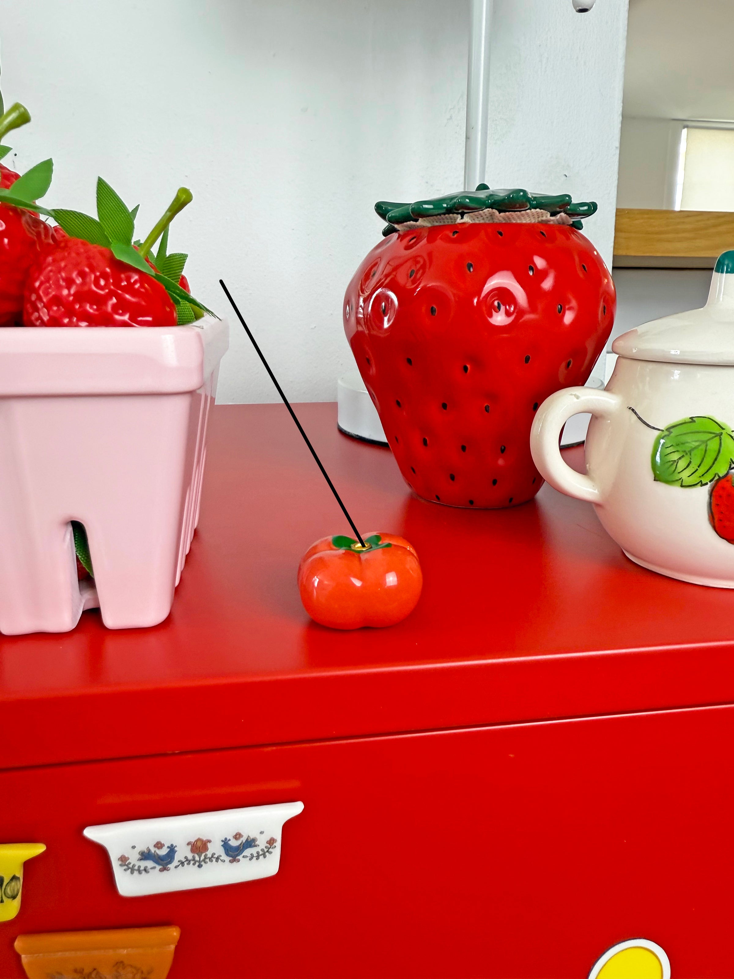 How adorable is this tomato incense holder? Elevate the way you burn incense with this kitschy piece! Simply place your incense of choice in the top of the tomato and light! Would look adorable sitting on a shelf or desk when not in use!