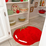 Measures 30" x 25". Design is a classic beefsteak tomato. Slip resistant backing, so no need to get rug tape! Made from 100% polyester, can be machine washed, but we recommend hand washing. Do not iron, air dry only.
