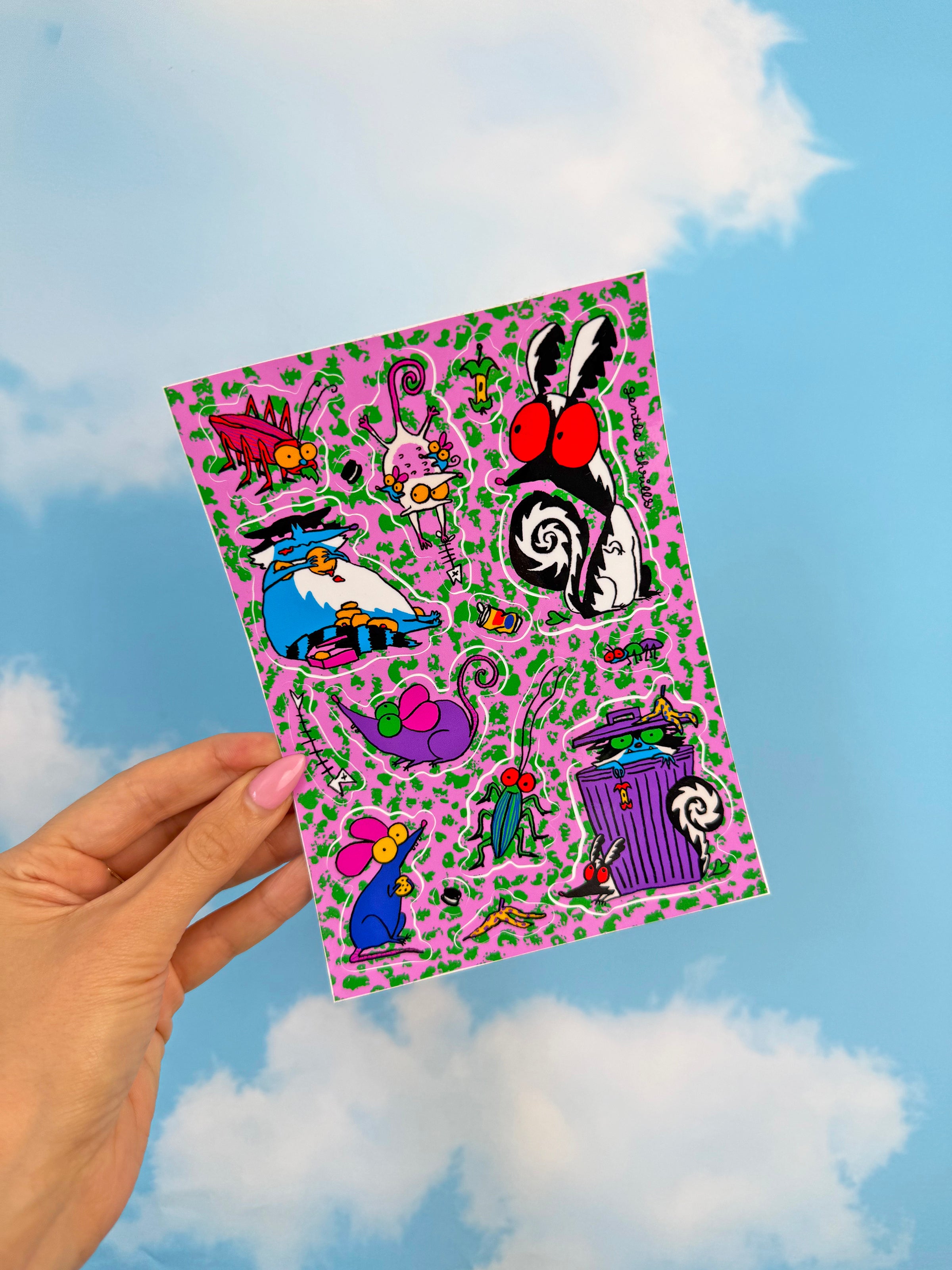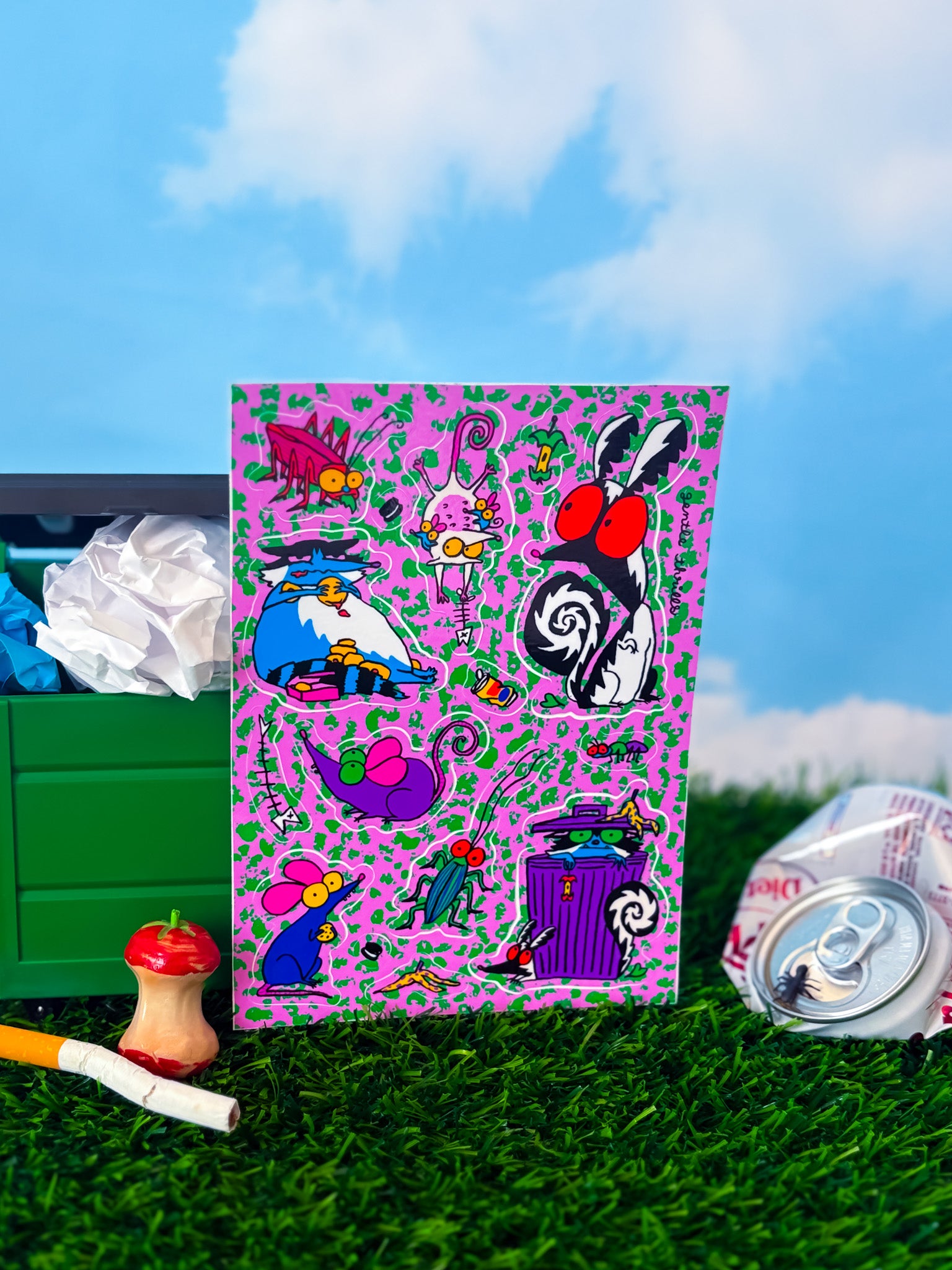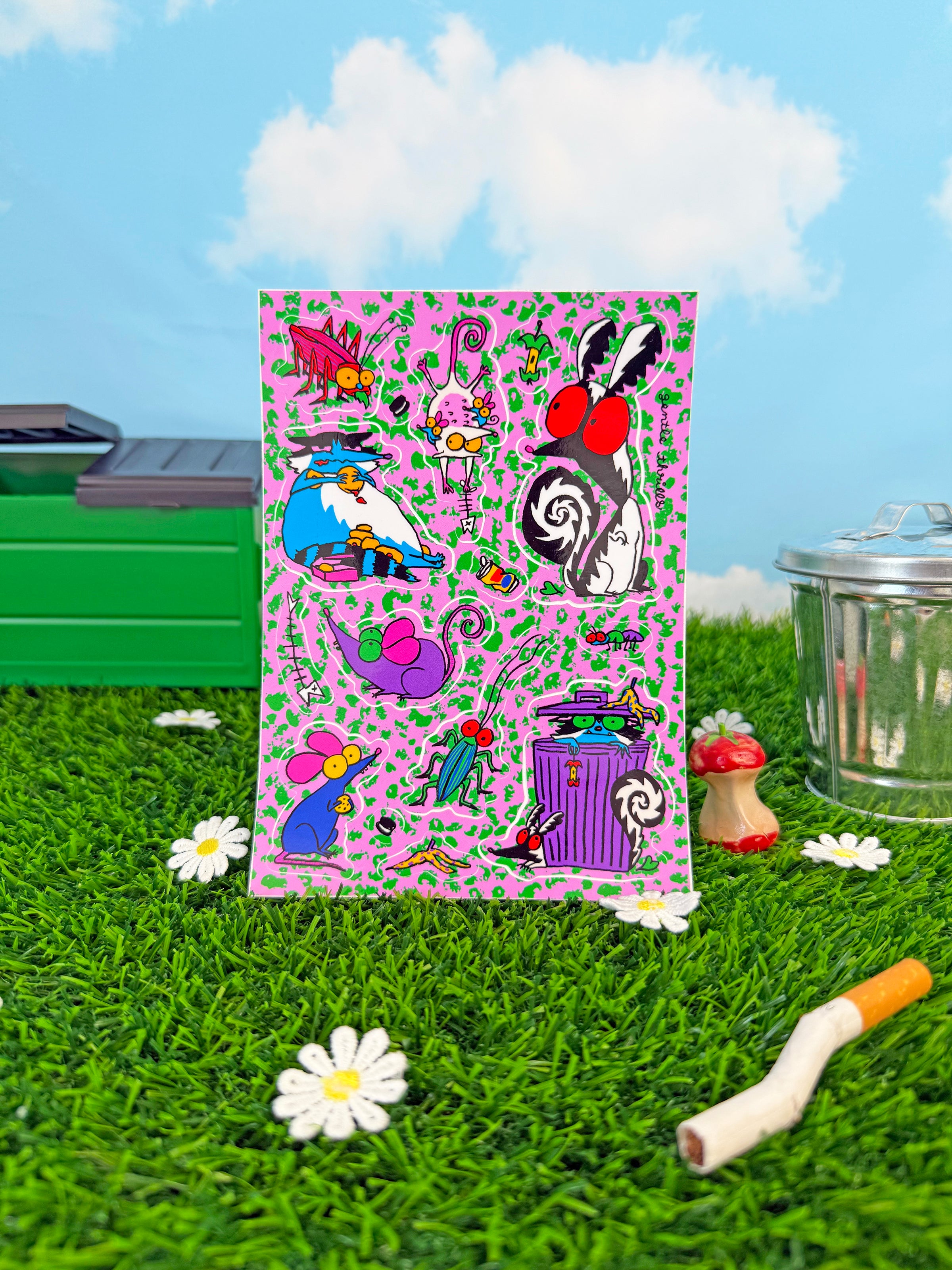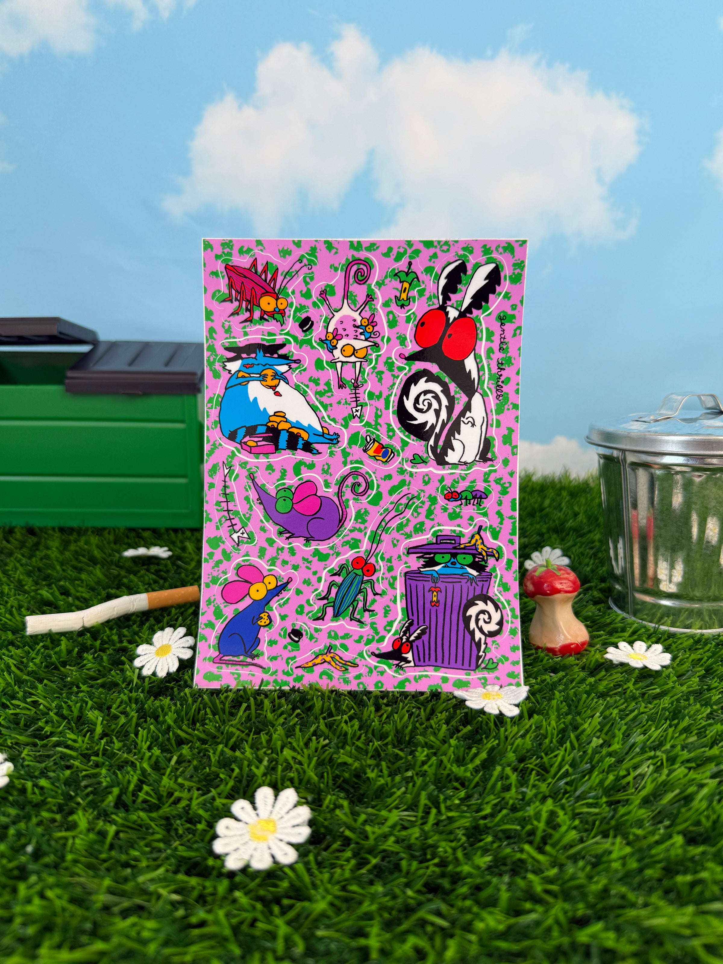 This vinyl sticker sheet features some cutie rats, roaches and skunks with their trashy treats - yummy!
