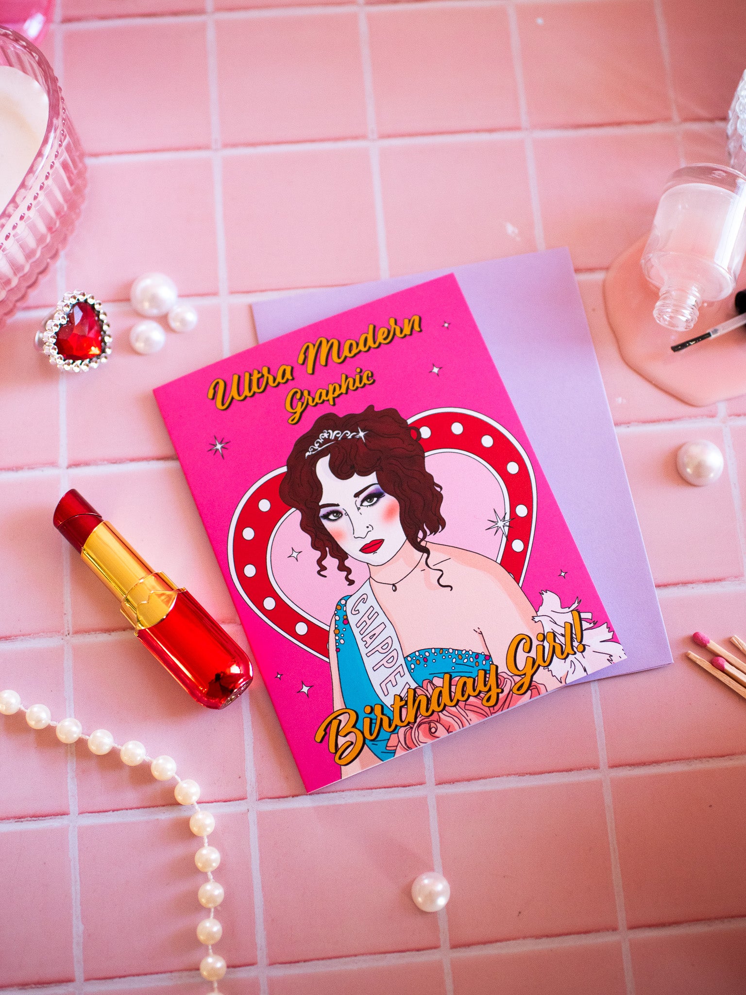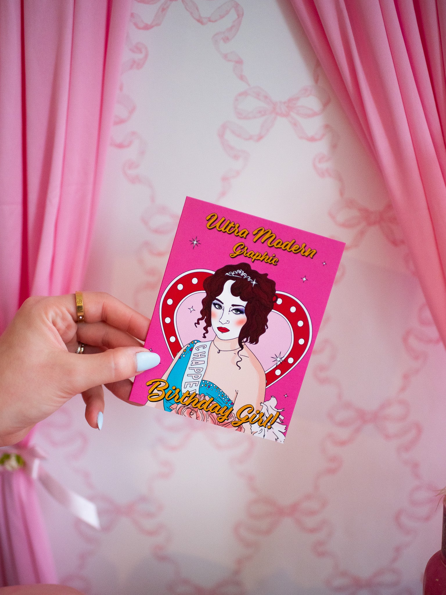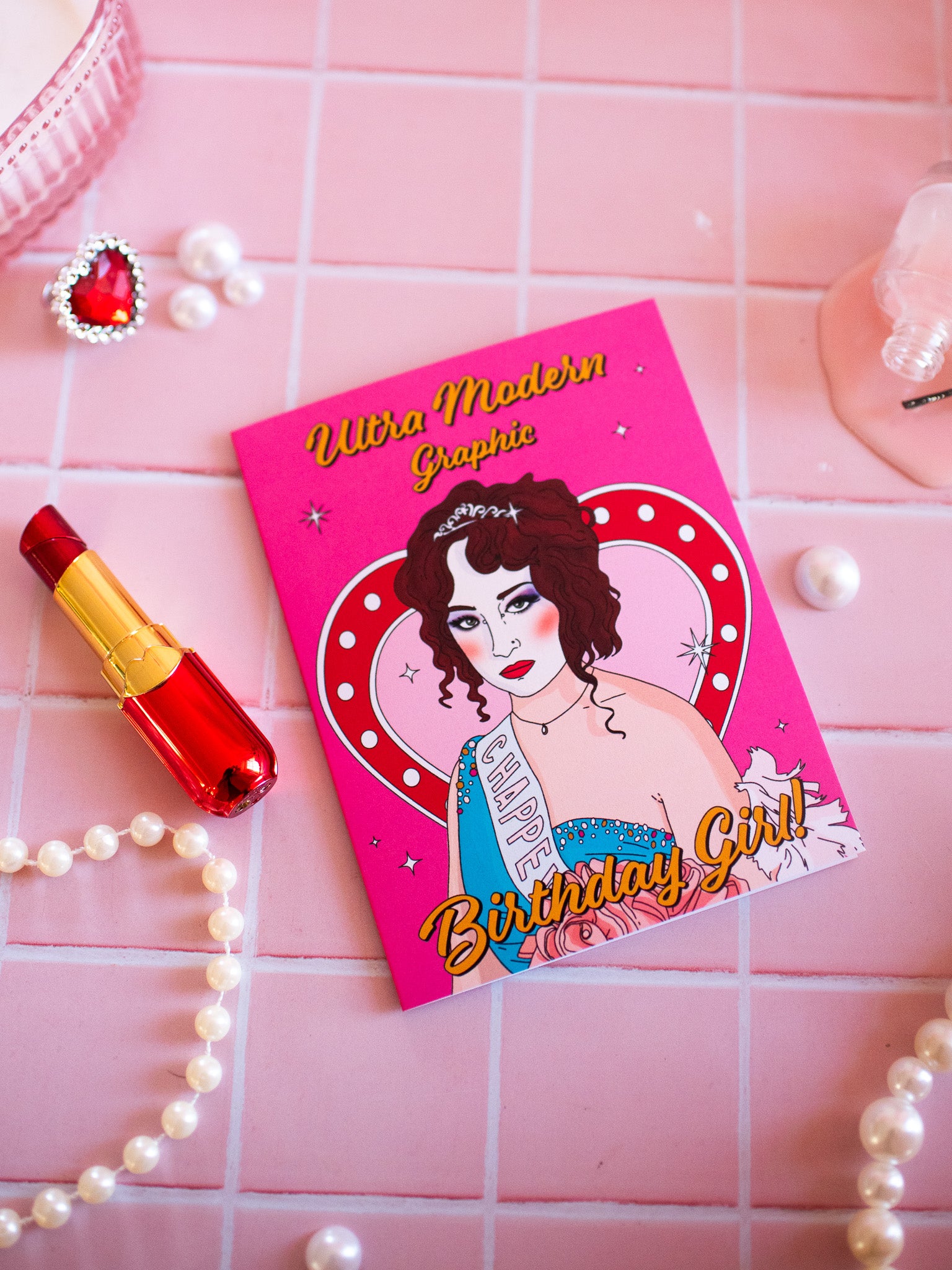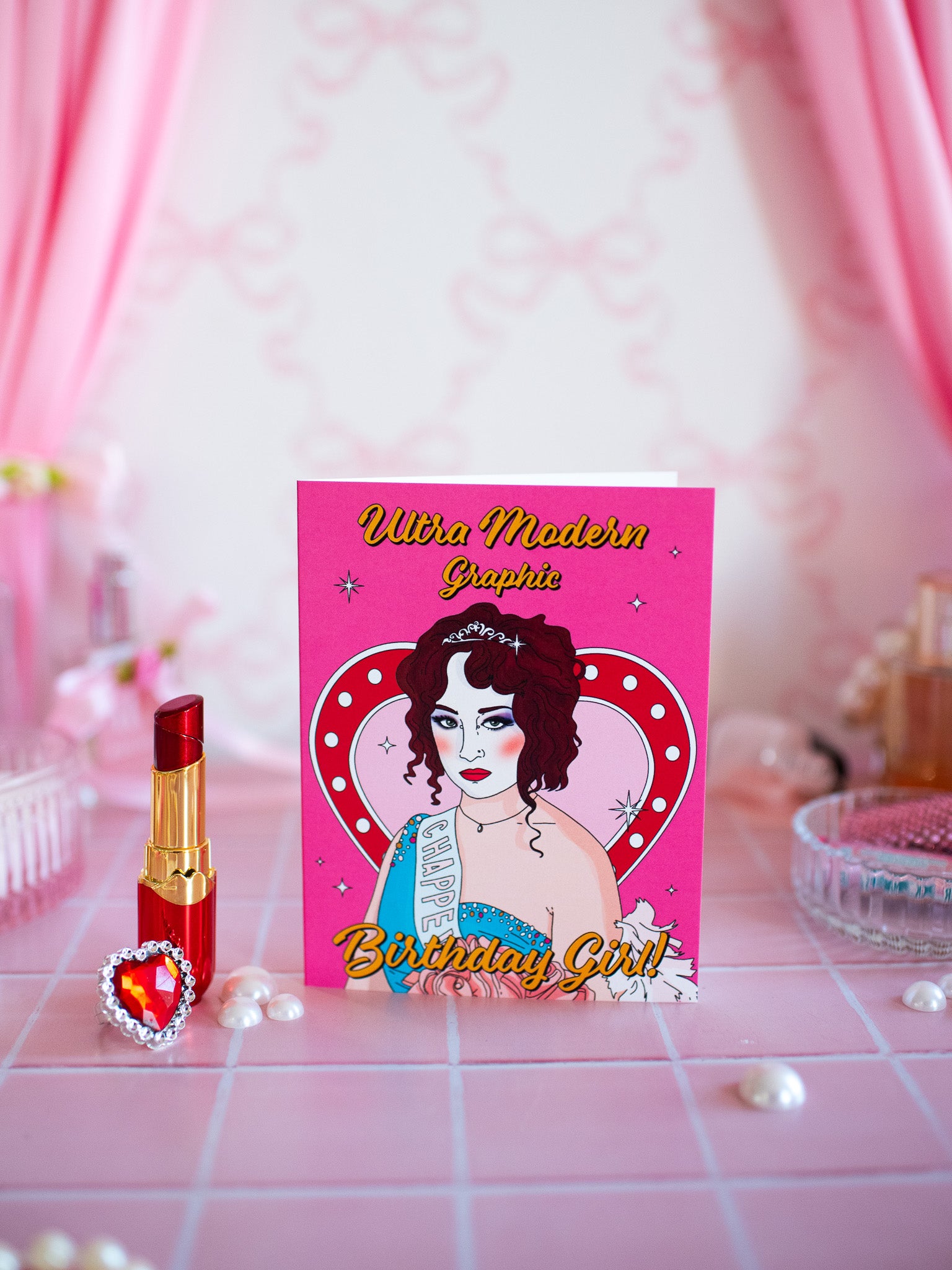 This card is stunning! Comes in a pretty pink color featuring everyone's fave gal, Chappell Roan standing in front of a vintage-style neon heart sign. The front of the card reads "Ultra Modern Graphic Birthday Girl!" Perfect birthday card for the Chappell fan in your life - we all know one!