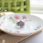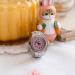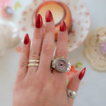 This cool watch ring is a best seller in our IRL shop in Nashville, TN! Yes, the watch face actually works! ⏱️ comes in silver with a pink face.