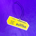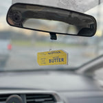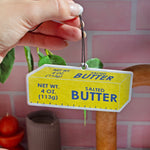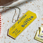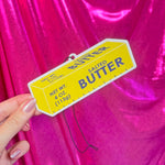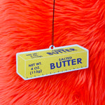 Measures 5" x 1.75" and is double-sided. Design is a classic yellow stick of salted butter.