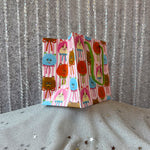 Features adorable kitties and bows on a pink and white striped background! Complete with matching green cotton rope handles for convenient carrying!