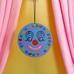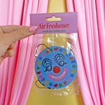 This blue air freshener features an iconic clown face surrounded by colorful shapes! Bubblegum scented and comes with an elastic cord to loop around a rearview mirror.