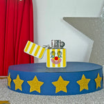 The front of this lighter has a white and yellow striped design and features an iconic smiling clown face, and the back has a red and white striped design. Perfect for lighting cigarettes, candles, or whatever else you need a fire for!