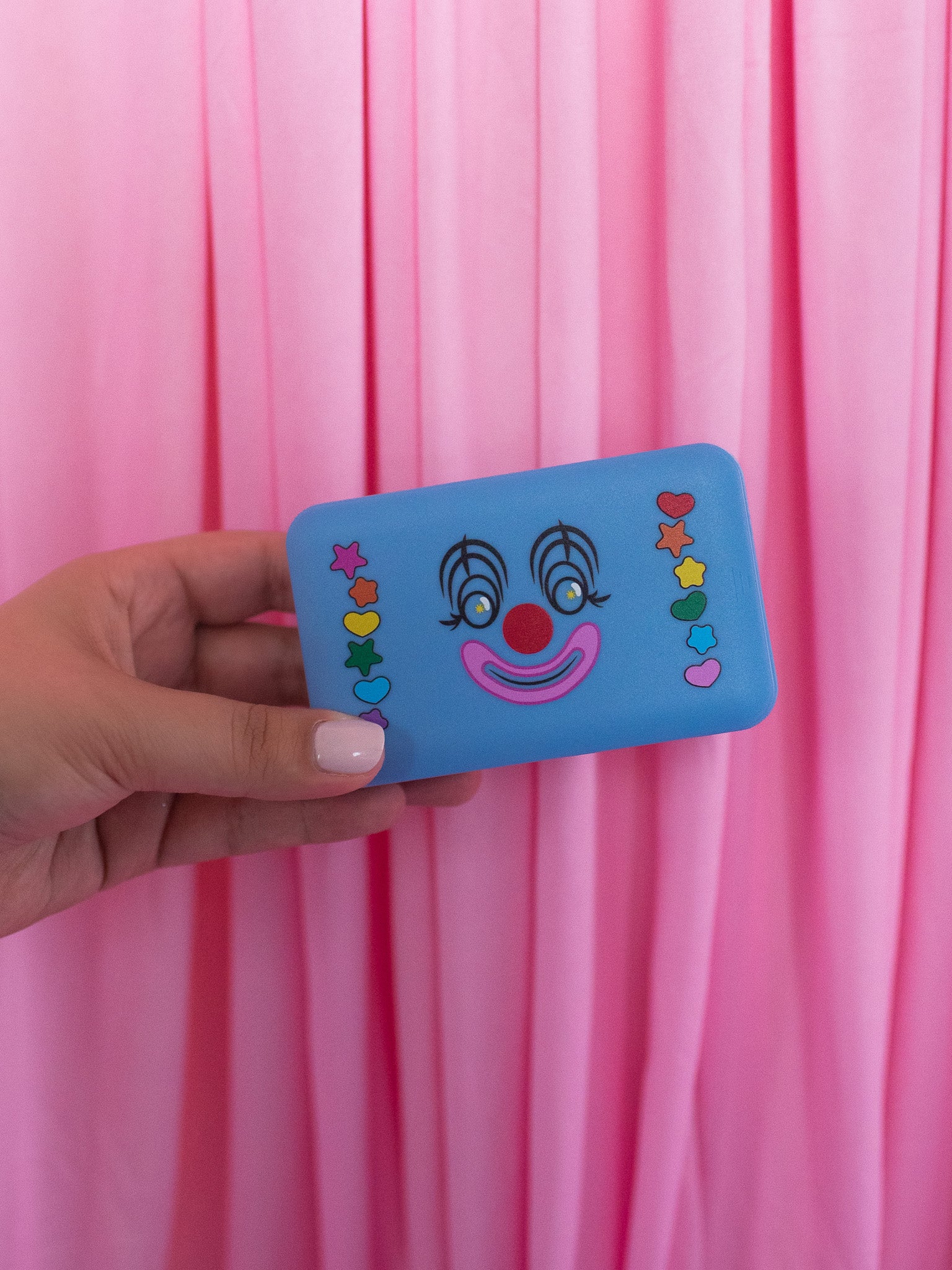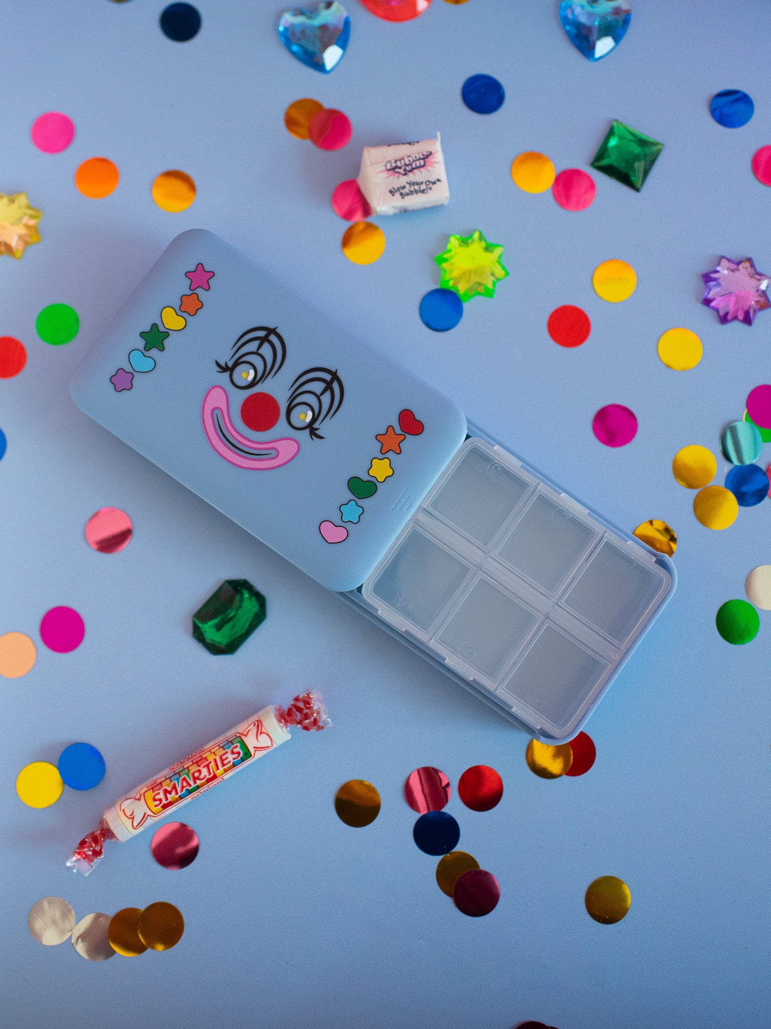 Carry your meds and vitamins in style with this blue clown pill case! Features an iconic clown face decorated with rainbow stars and hearts! Slide open the top to reveal 6 convenient, separate compartments. Water proof + smell proof.