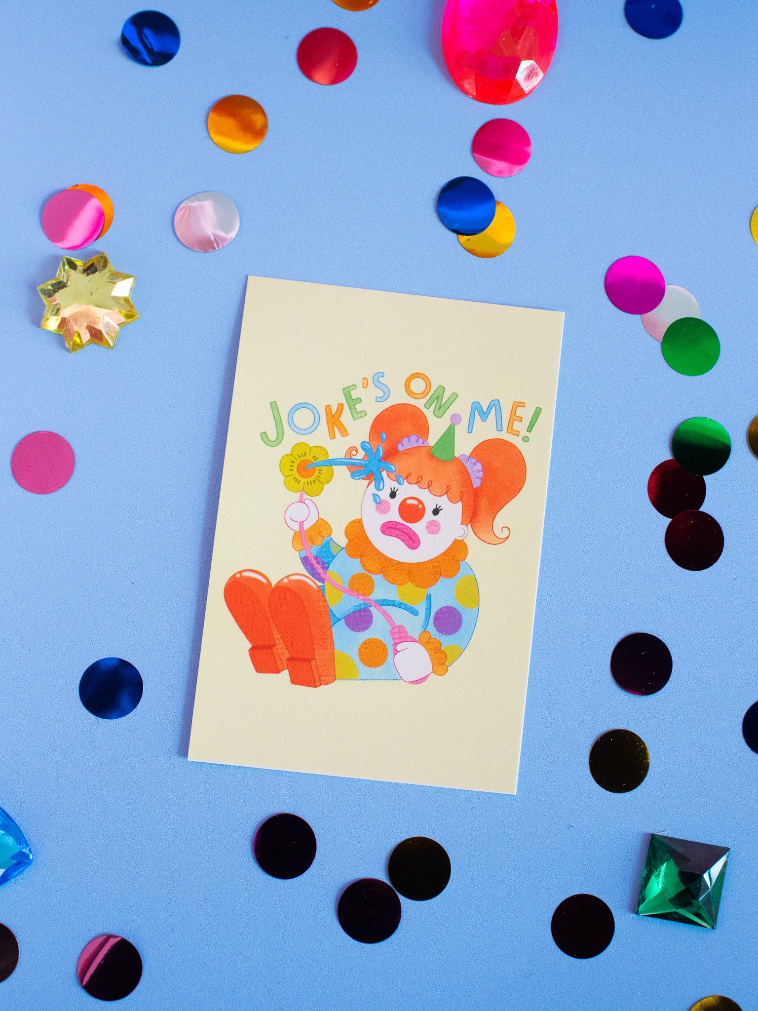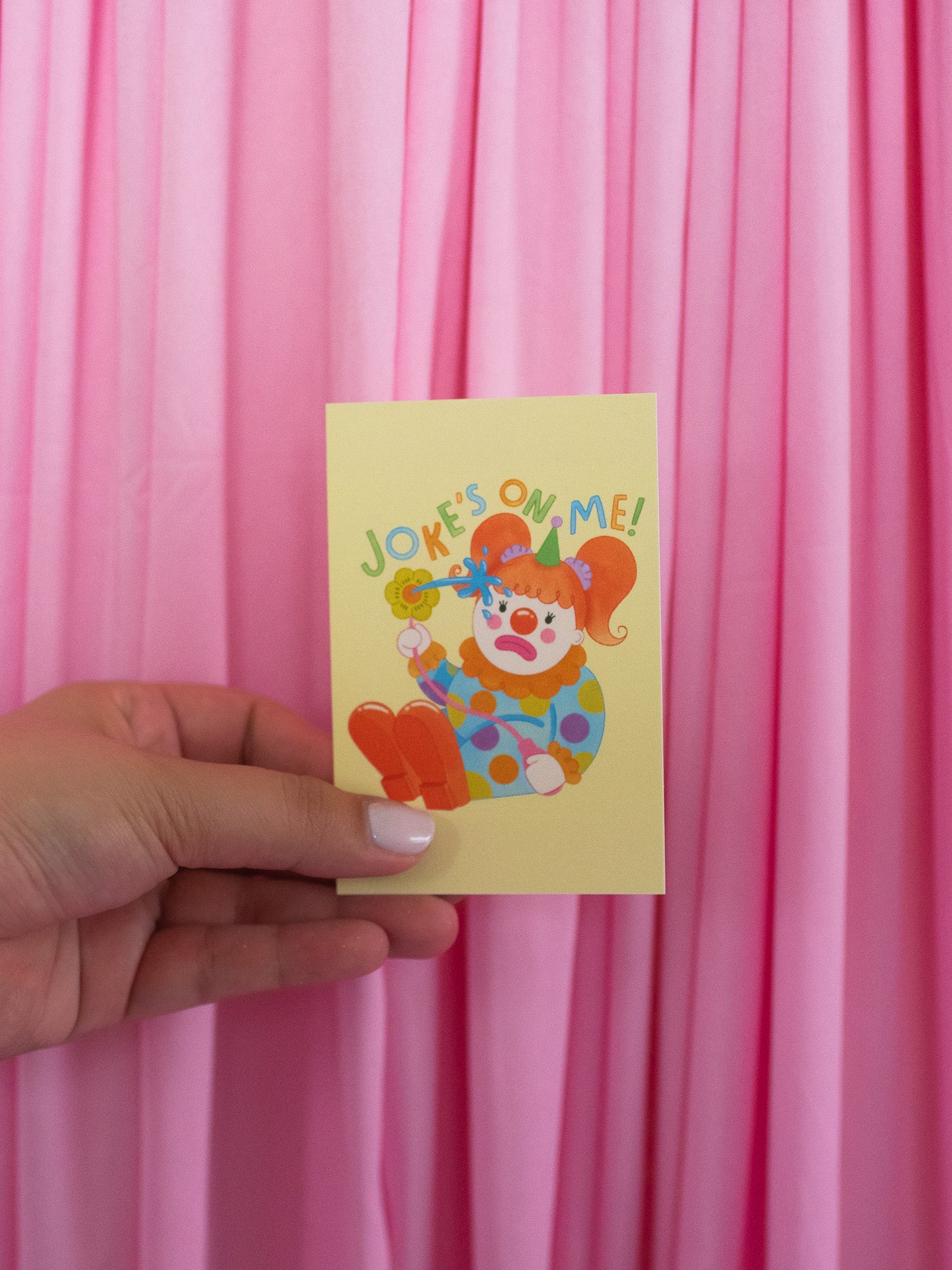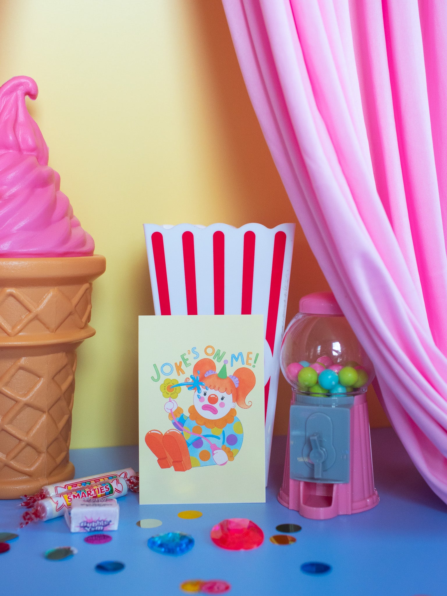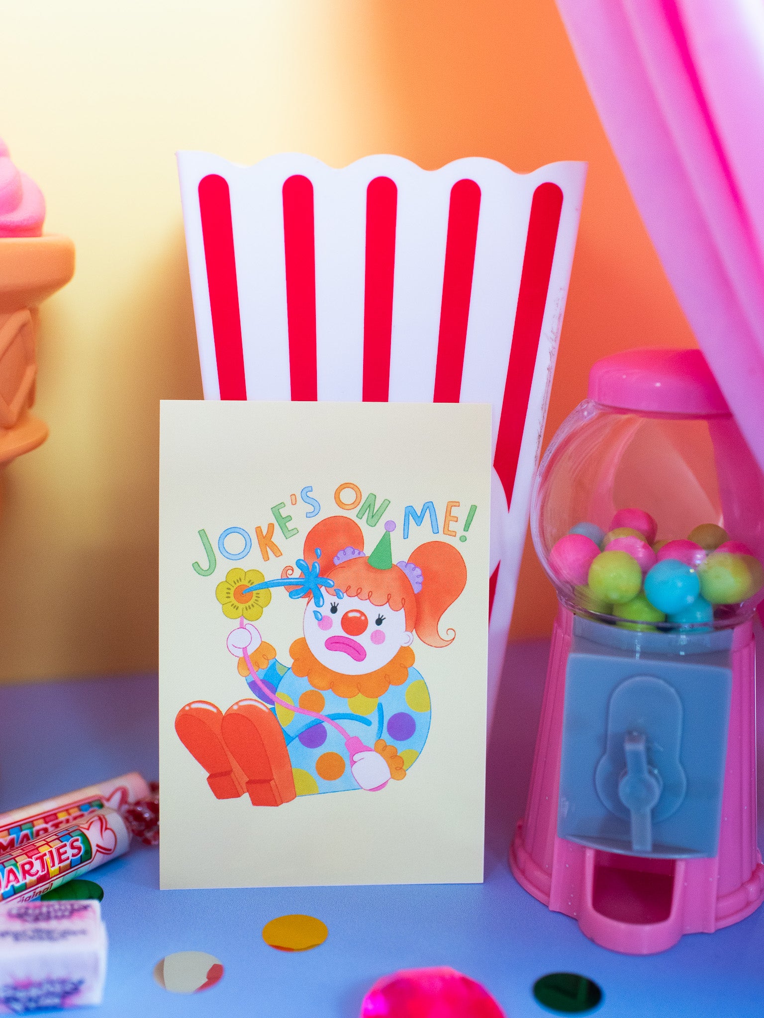 This print features a silly little clown pranking herself with a water spraying flower and reads "Joke's on me!" Guaranteed to look adorable on a shelf and makes for the sweetest gift!