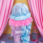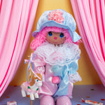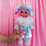 We're obsessed with this pink and blue precious moments clown doll! Her clown look features pink hair, a pink nose, blue eye makeup, and pink flowers painted on her cheek. Her outfit is a classic clown jumpsuit with lace details on the collar and cuffs. Oversized shoes and a hat complete the ensemble. This doll is really serving!