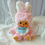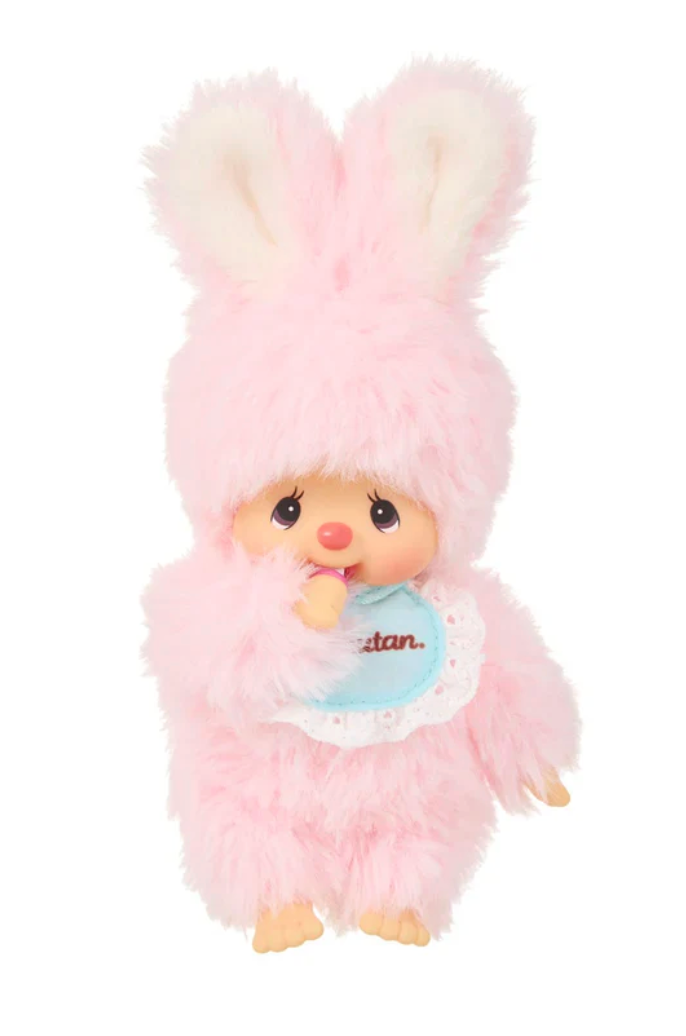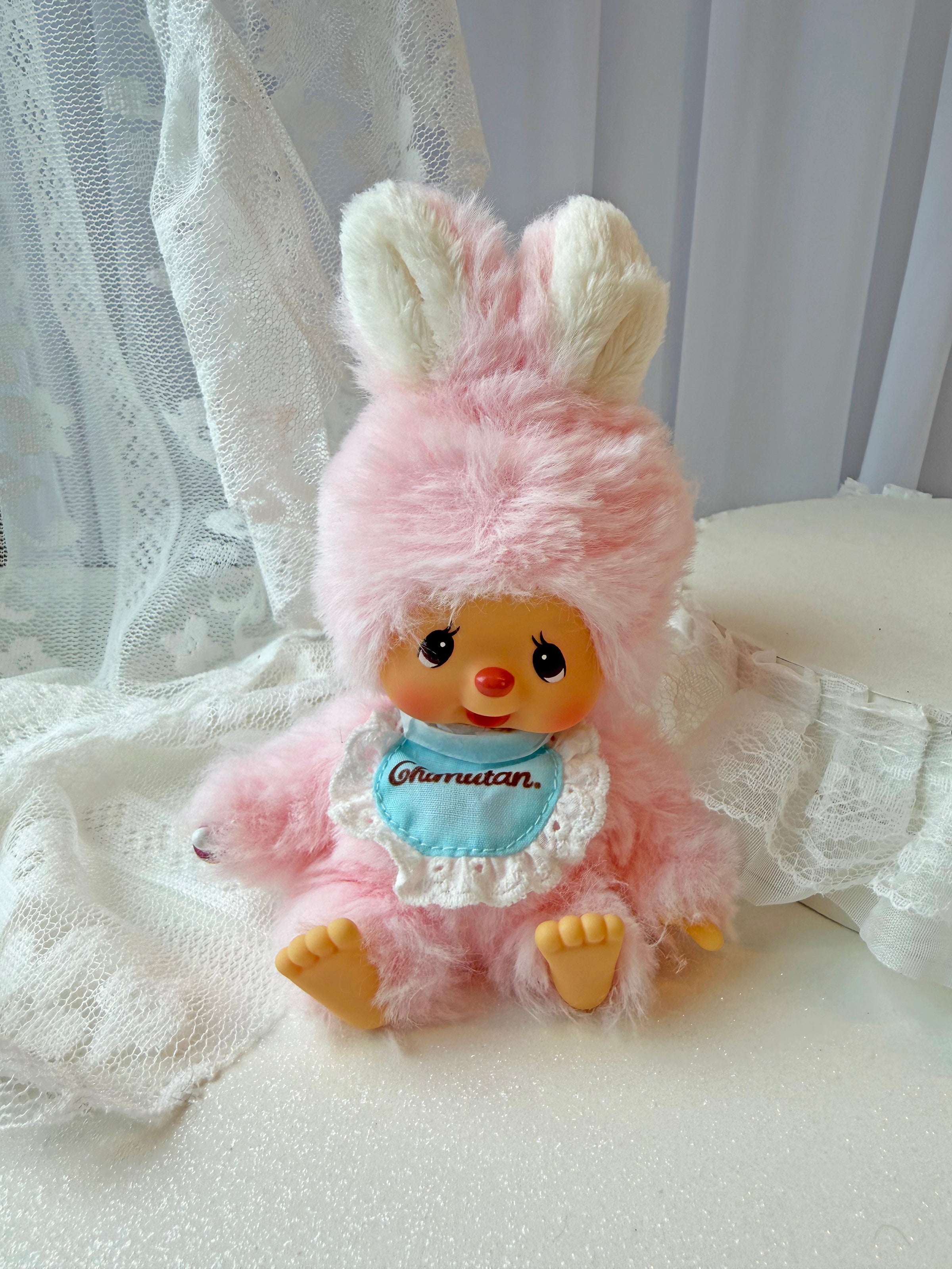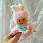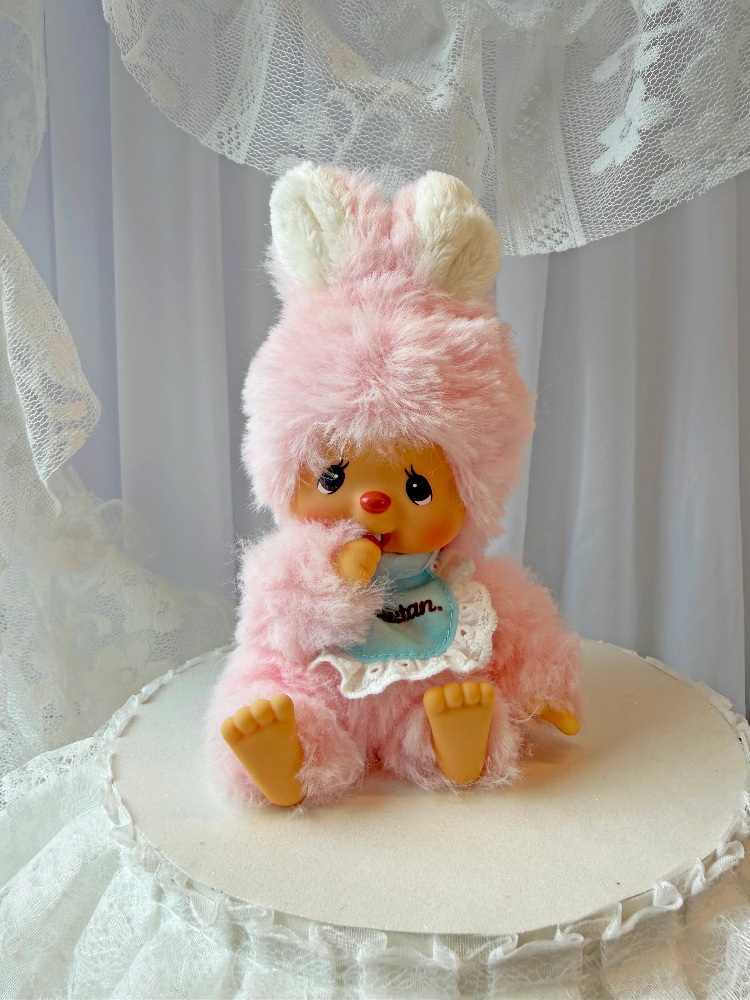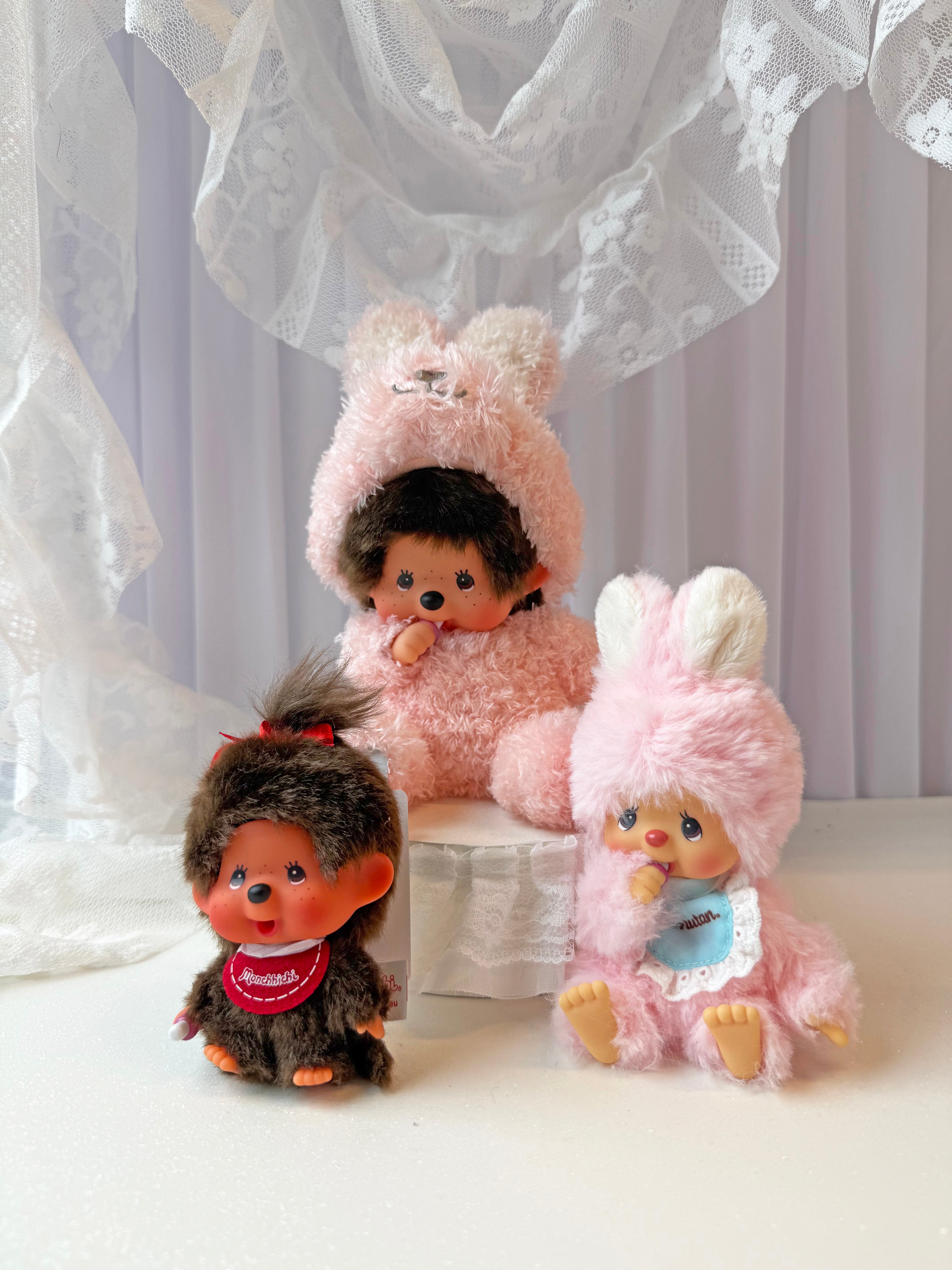 This Monchhichi is bundled up in the coziest pink bunny costume you’ve ever seen, with super soft fabric and a snuggly hood! She also has the classic bib that reads "Chimutan." Perfect for gifting, adding to your growing collection, or just to add some fun vibes to your space!