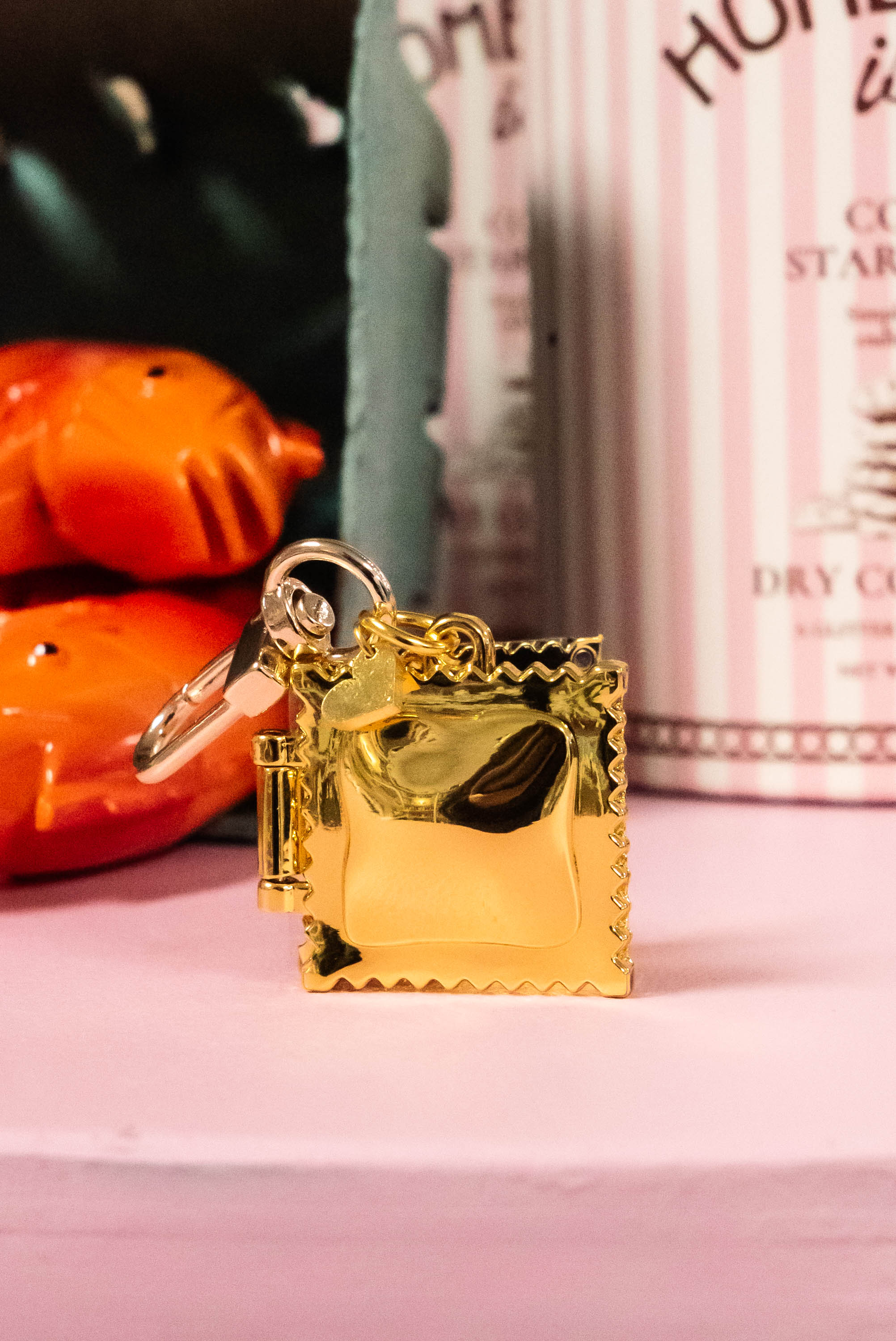 Made of gold plated zinc alloy, this ravioli has a hinge so you can keep something special inside. We recommend a square of cheese to snack on later.