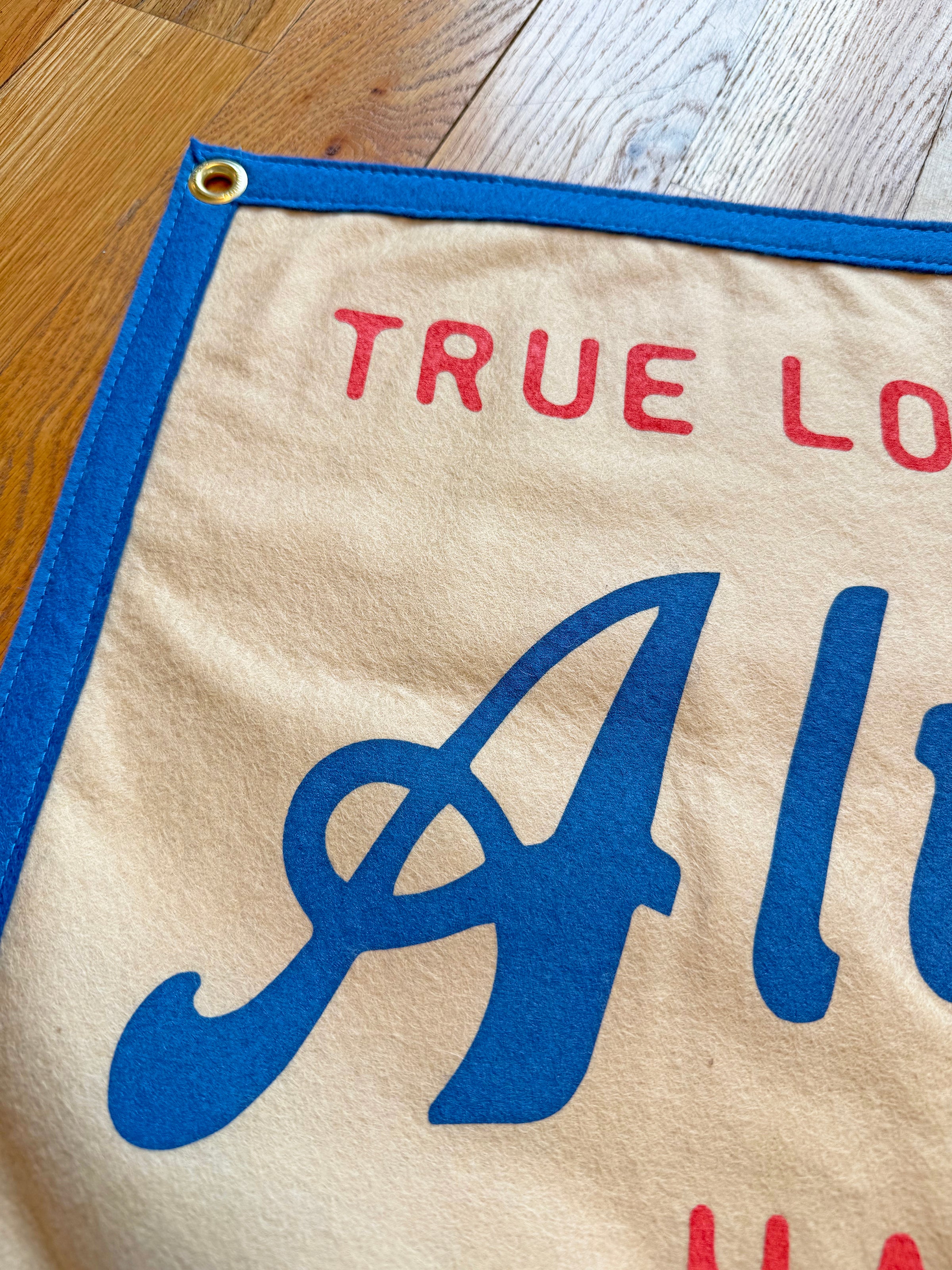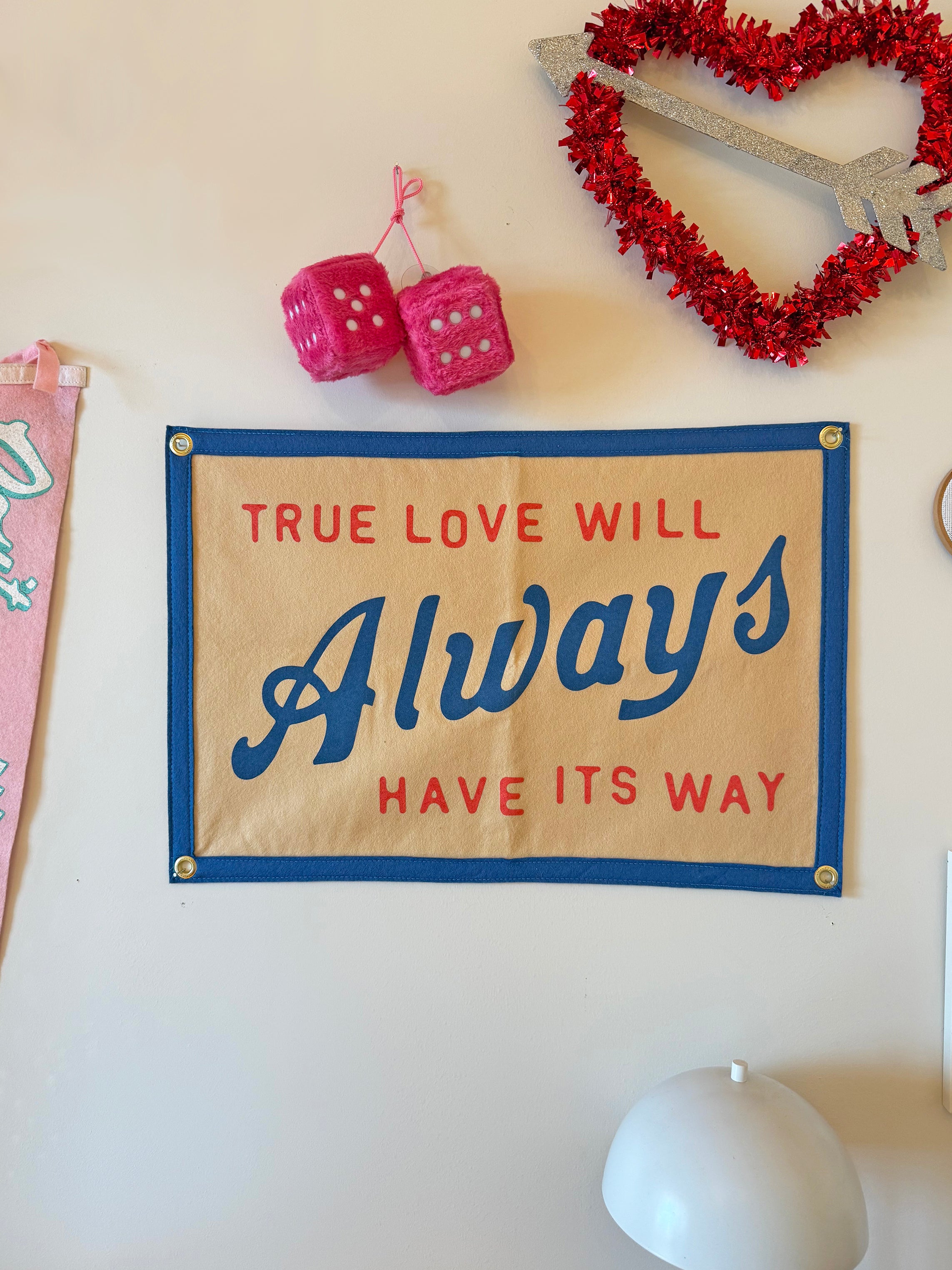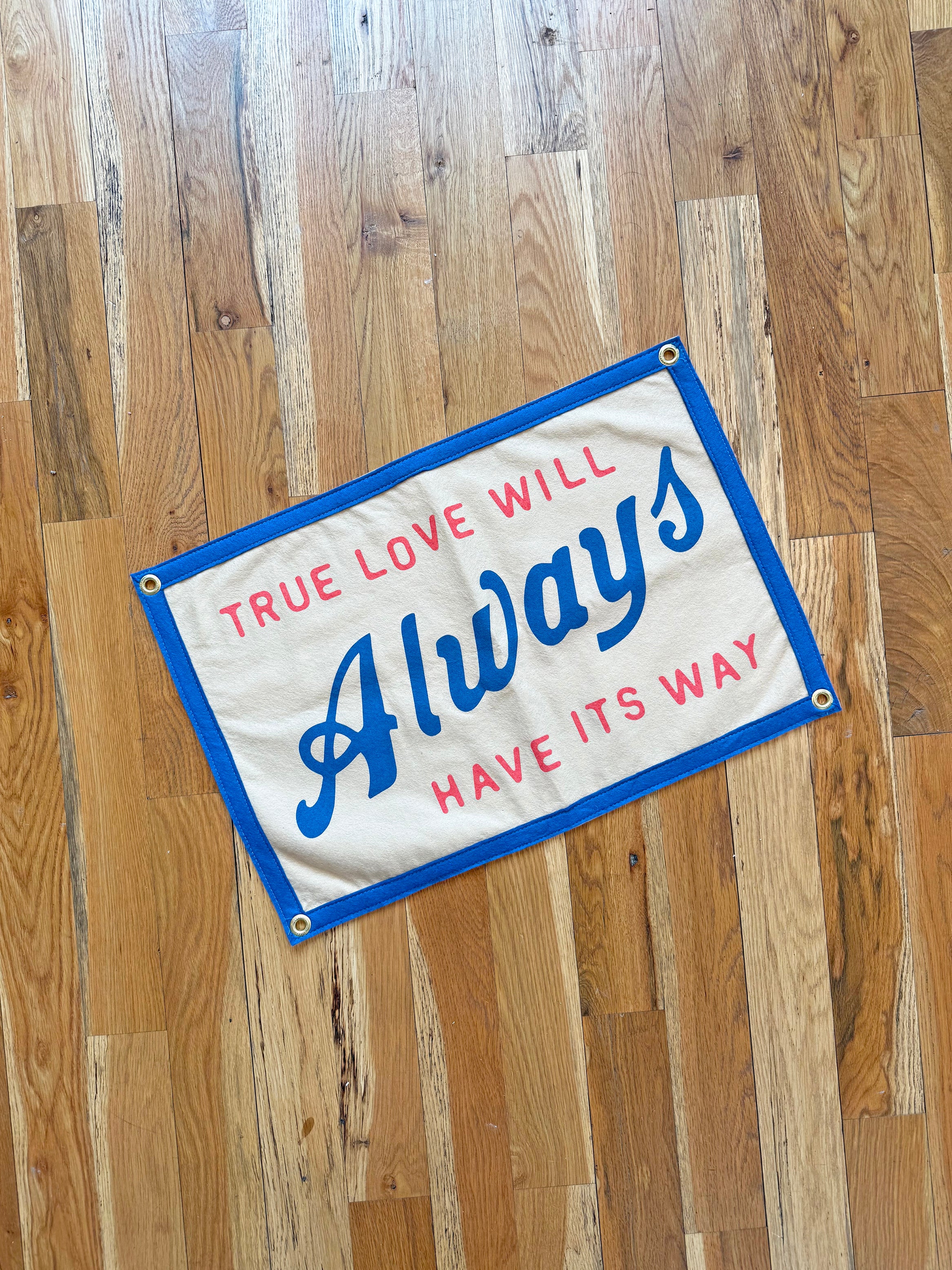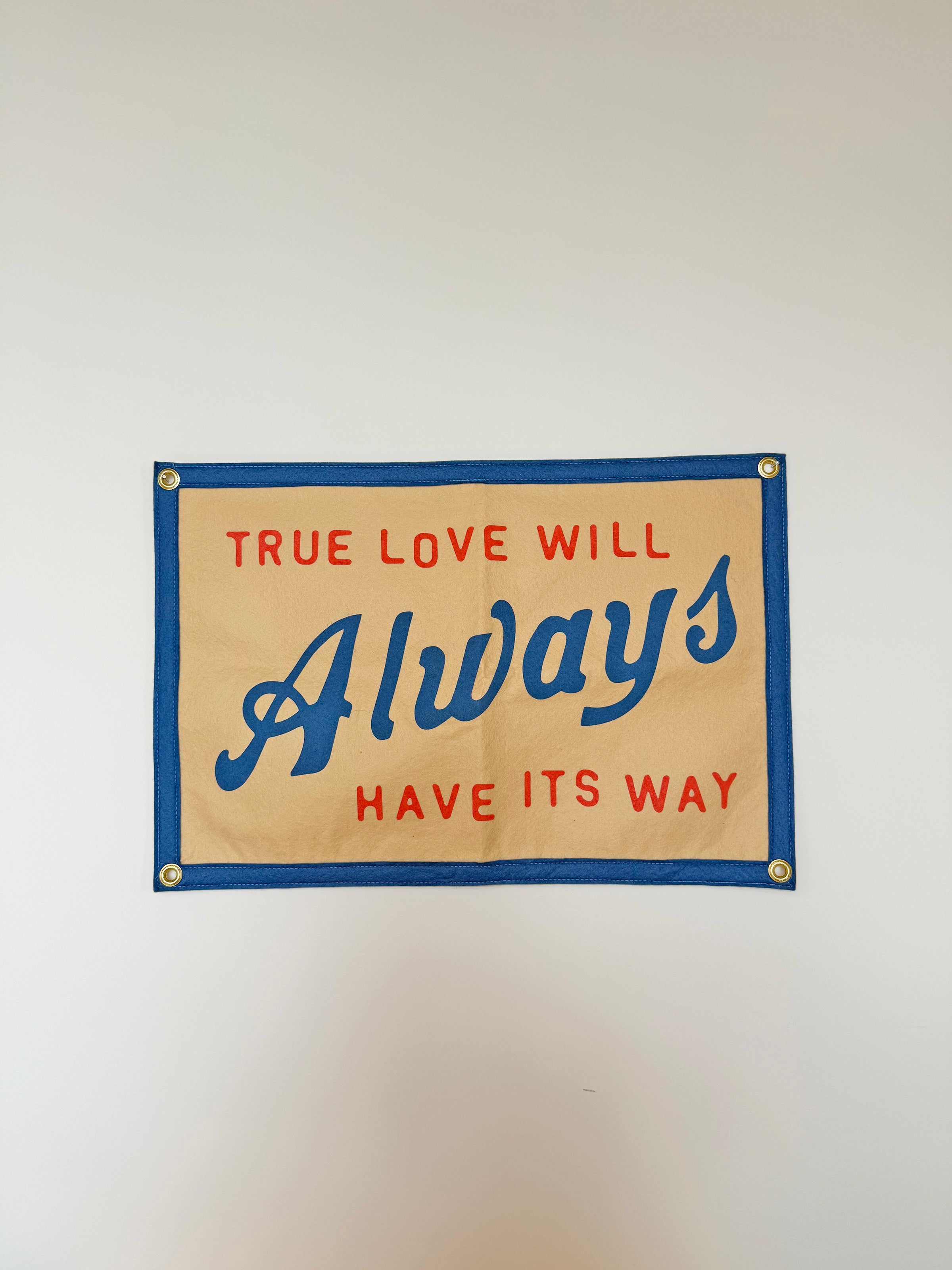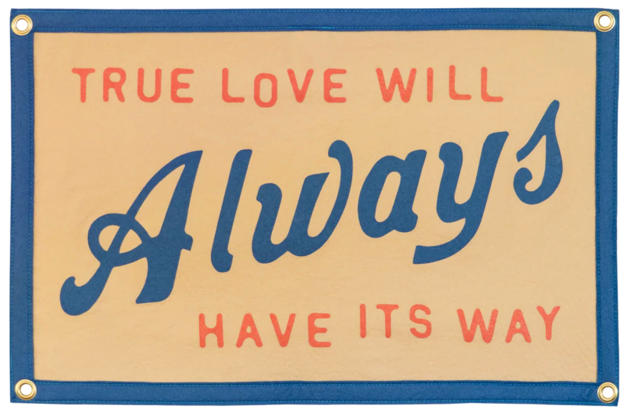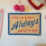 This sand-colored flag channels vibes from iconic musician, John Prine. It reads "True love will always have its way" in a red and blue, vintage inspired font! The design also features matching blue borders! It has 4 grommets, one on each corner, for easy hanging. Perfect to hang in your bedroom, the blank spot on your photo wall, or even as a cute photo prop!