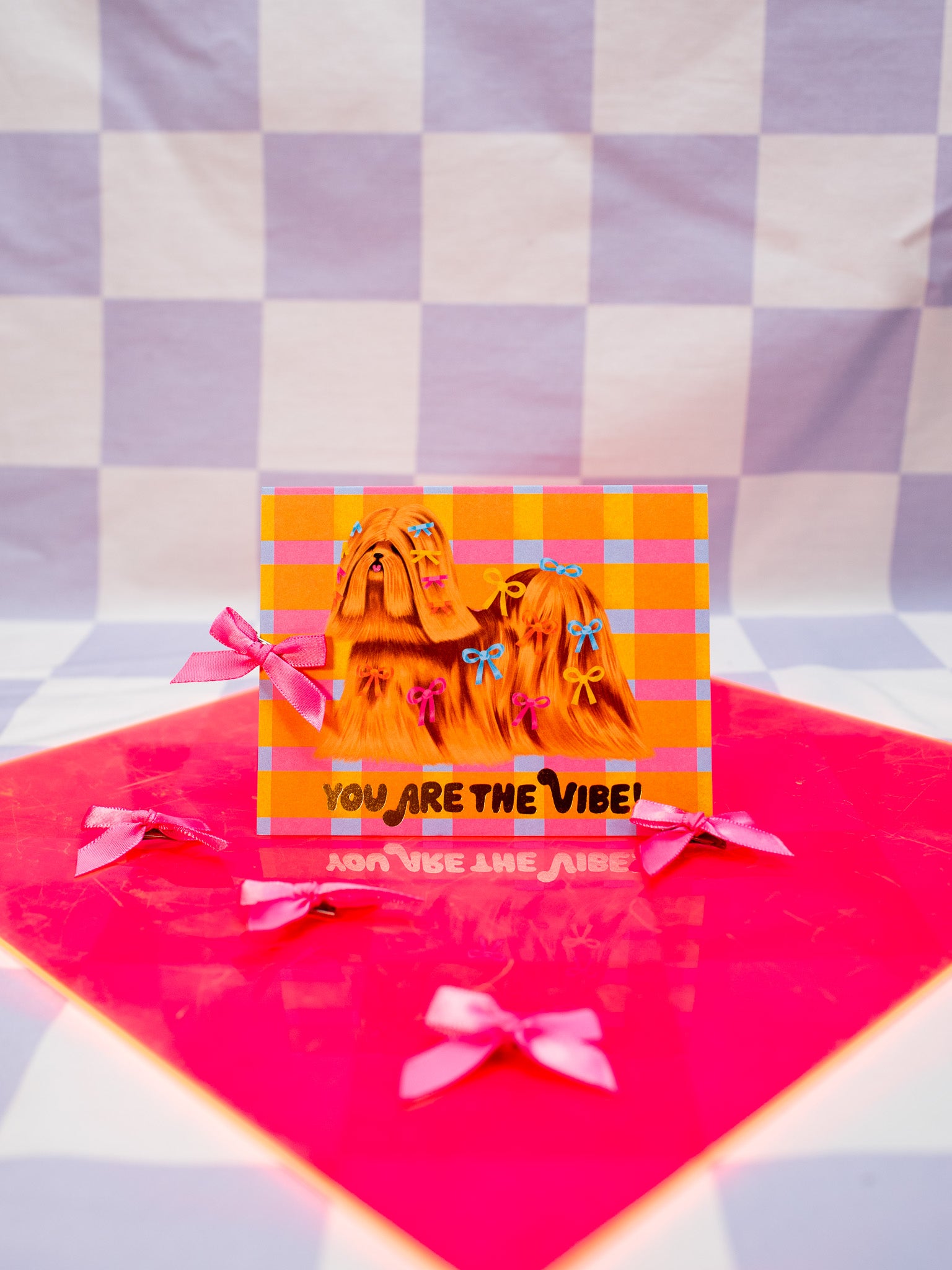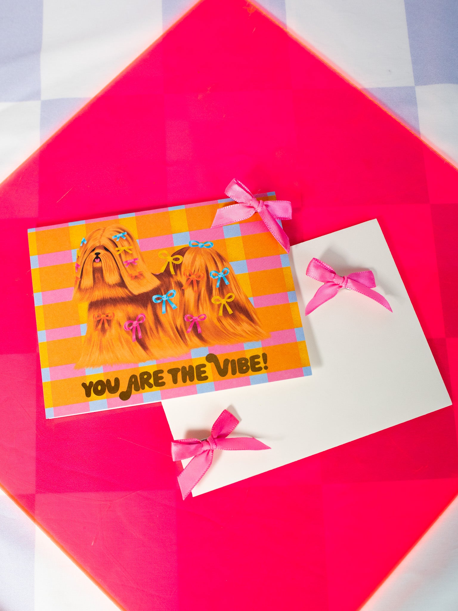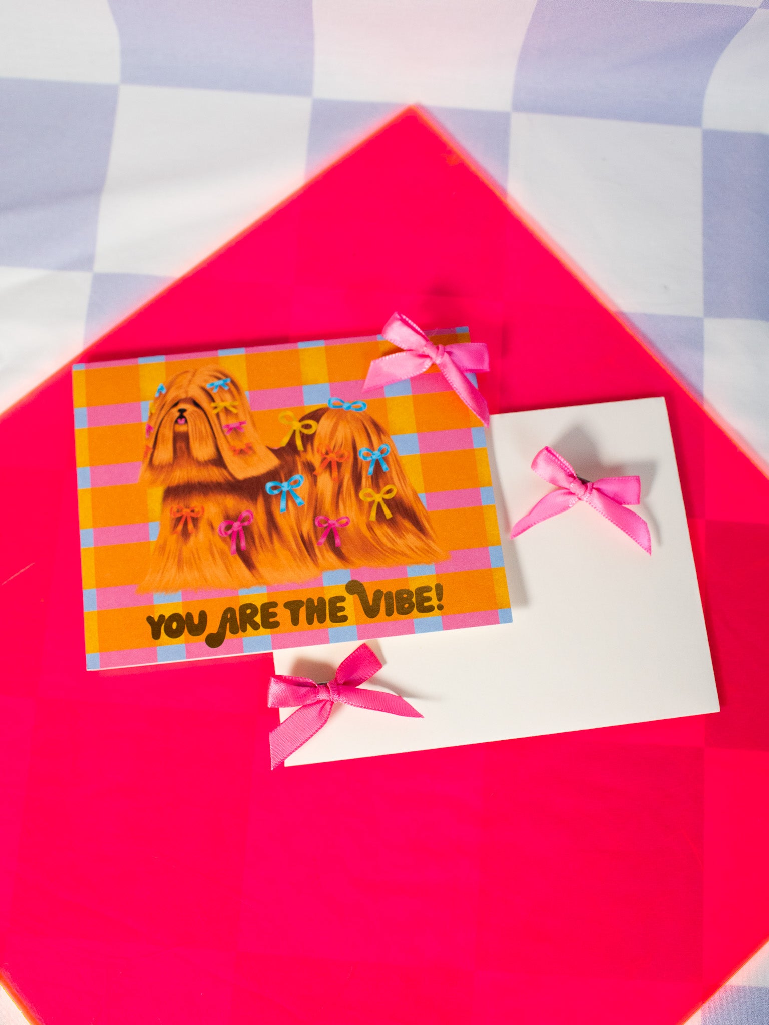 Have you ever seen anything cuter than this coquette pup with bows all over her hair? Probably not! Tell your people they are the vibe with this cute doggy card! Perfect for birthdays or just because!