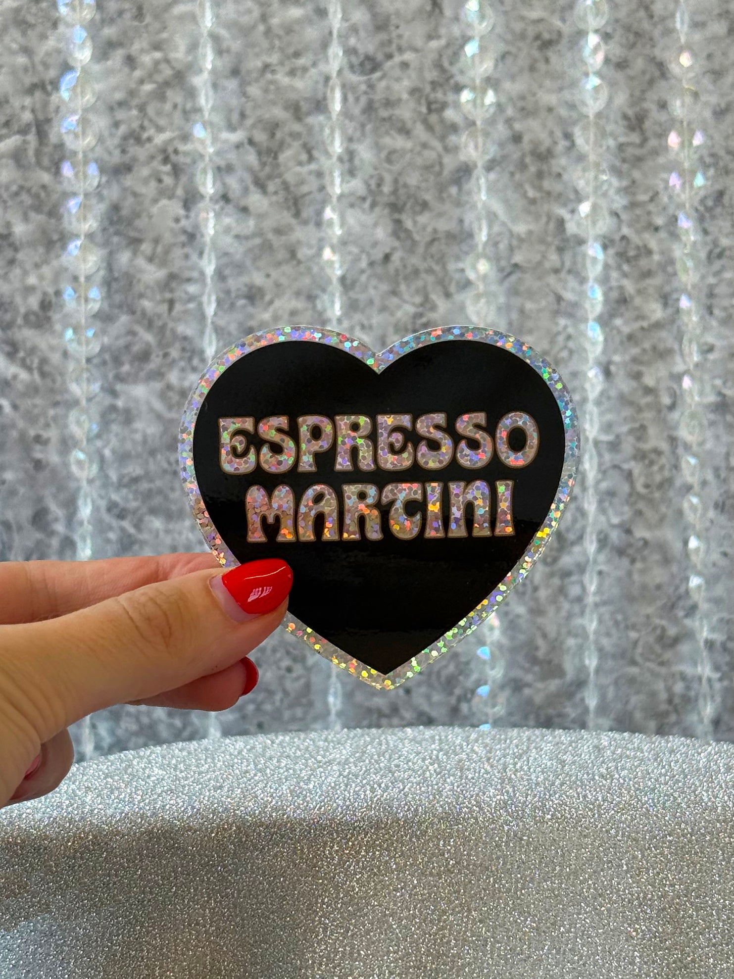 Inspired by the cocktail we all know and love. The holographic glitter details look too pretty in the light! Put this heart shaped sticker on your car, water bottle, laptop, or anywhere you want with full confidence that it will last!