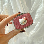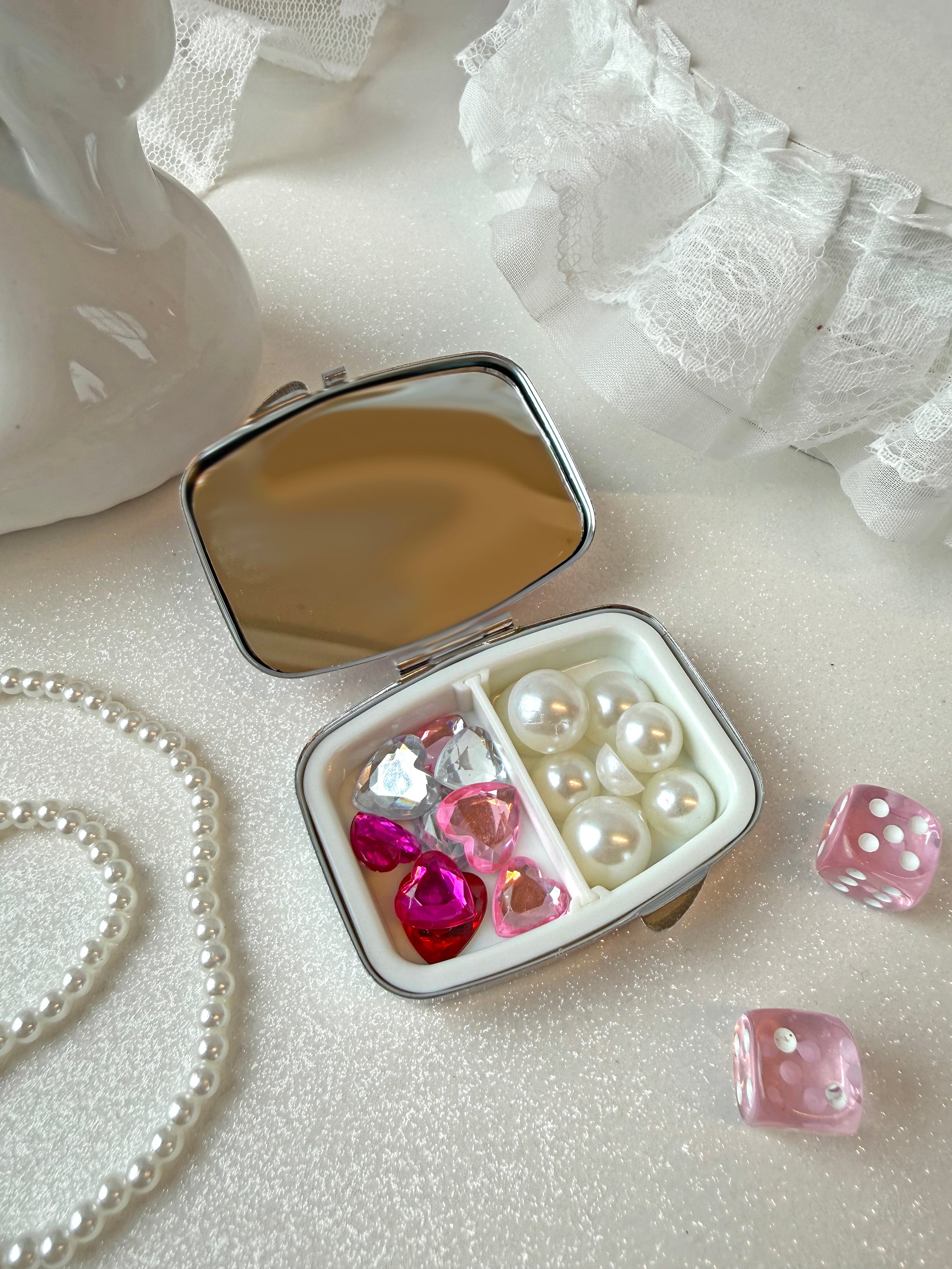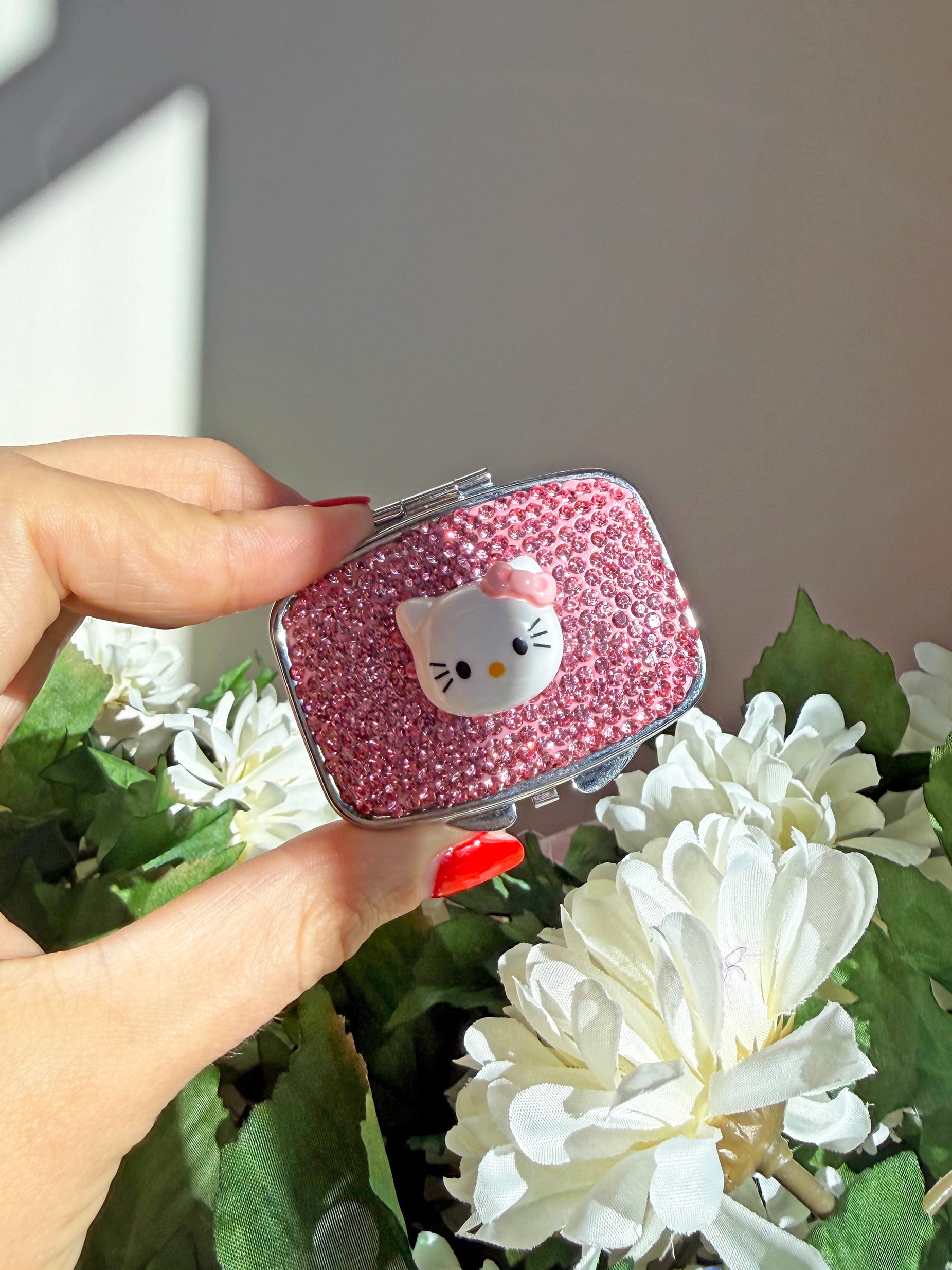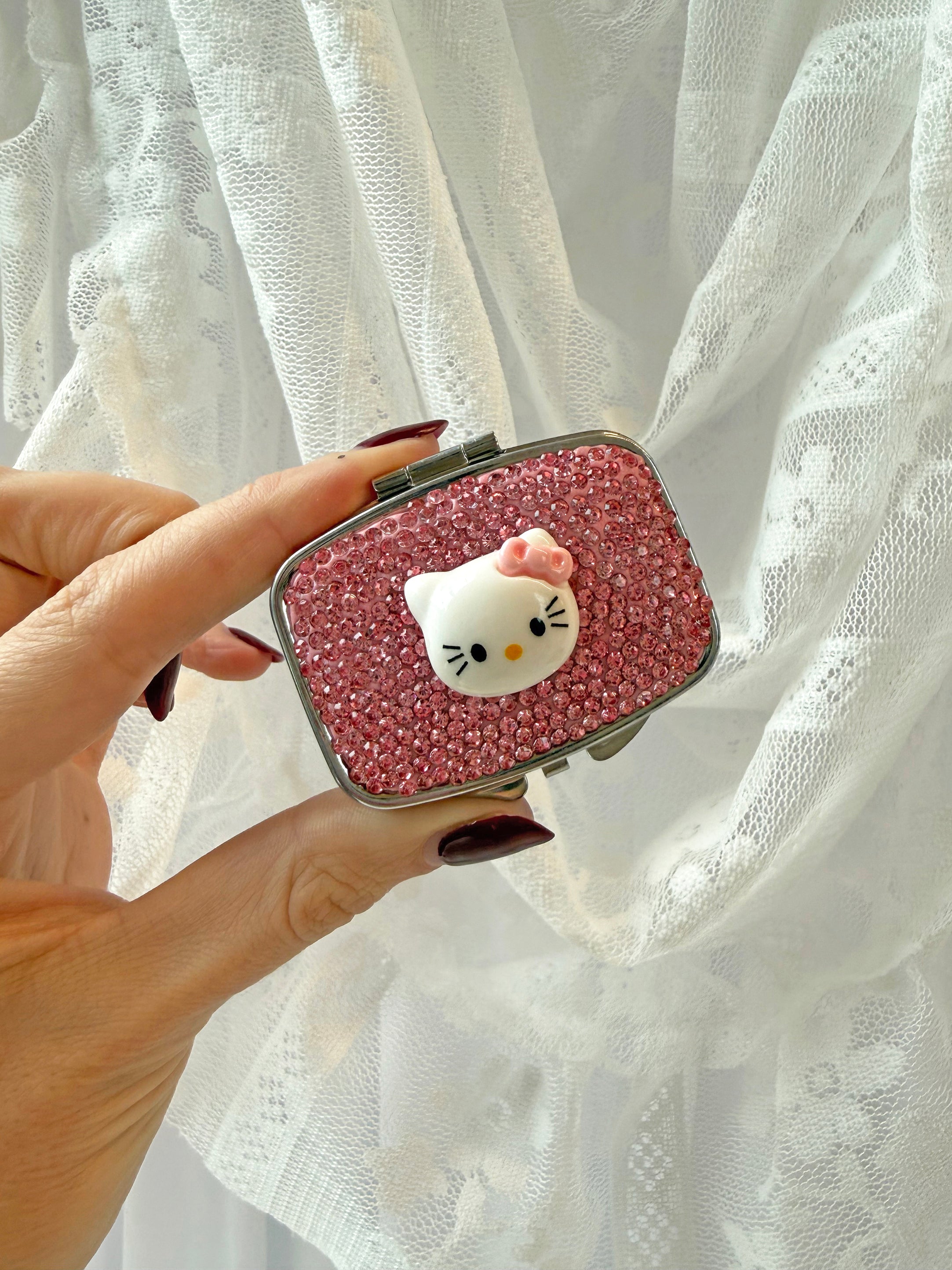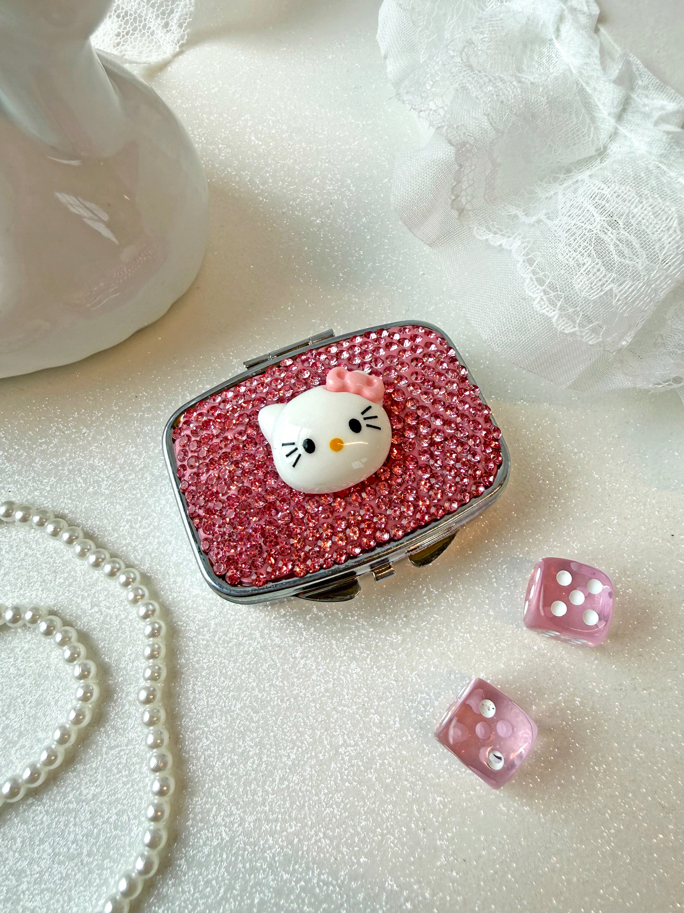 Carry your meds and vitamins in style with this iconic pill case that features our favorite Japanese kitty and is covered in pink rhinestones! Pop open the top to reveal 2 convenient, separate compartments and a mini mirror in the lid! Super cute and functional!