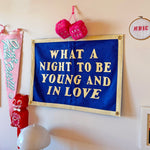 This bright blue flag reads "what a night to be young and in love" in a cream-colored font! It has 4 grommets, one on each corner, for easy hanging. Perfect to hang in your bedroom, the blank spot on your photo wall, or even as a cute photo prop!